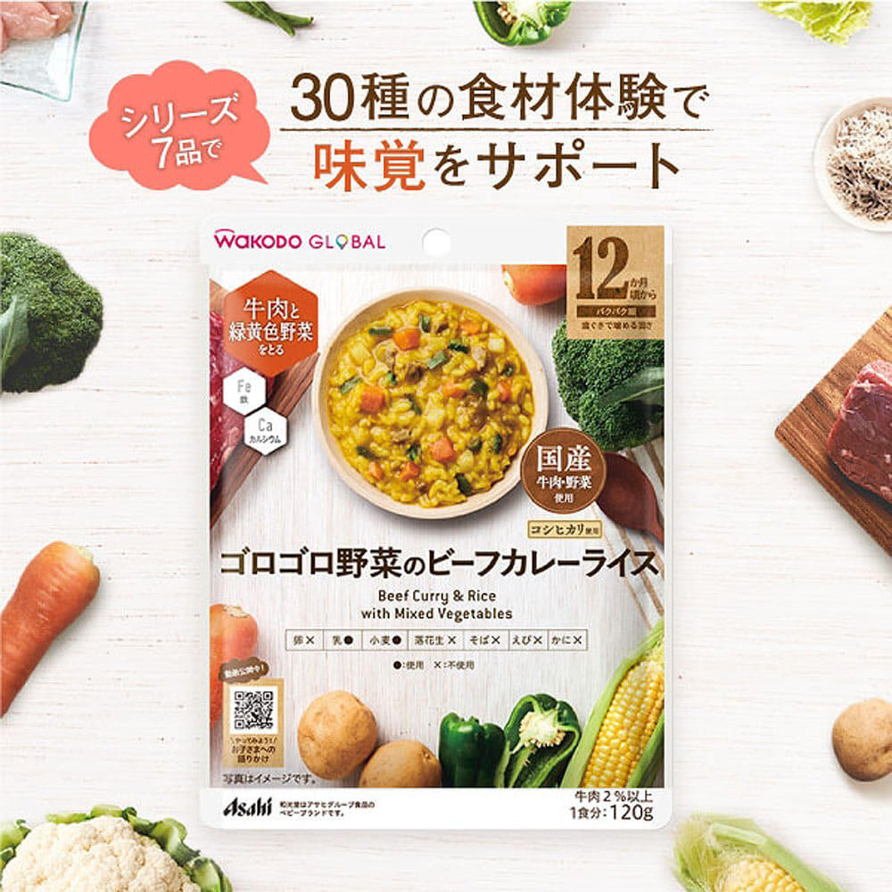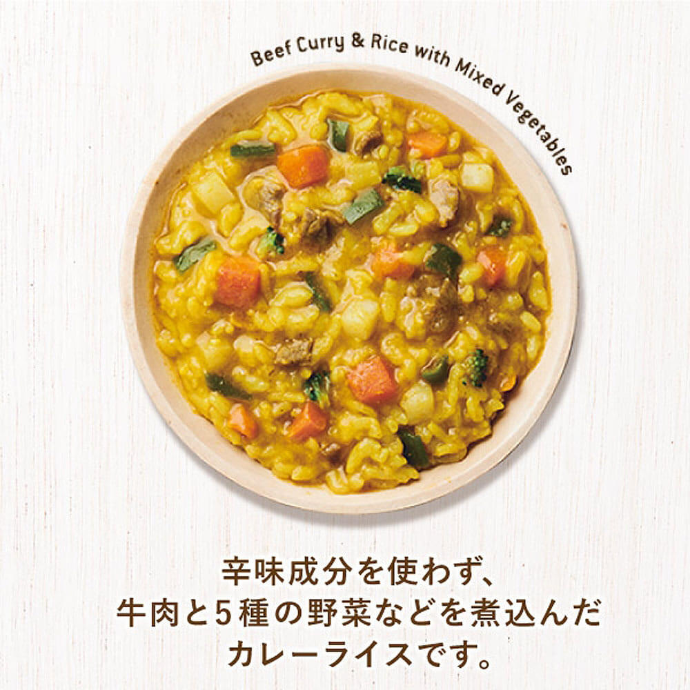 <原材料> 精白米(国産)、野菜ピューレー(たまねぎ、スイートコーン)、野菜(にんじん、ピーマン、ブロッコリー)、じゃがいも、牛肉、しょうゆ(小麦・大豆を含む)、チキンブイヨン、ぶどう糖、カレー粉、ミルクカルシウム、米酢、食塩/増粘剤(加工でん粉)、ピロリン酸鉄