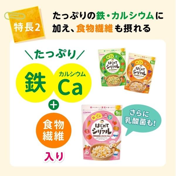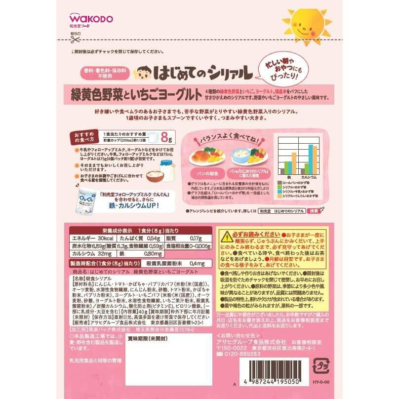 4種類の緑黄色野菜といちご、ヨーグルト、国産米をパフにした甘さひかえめのシリアルです。