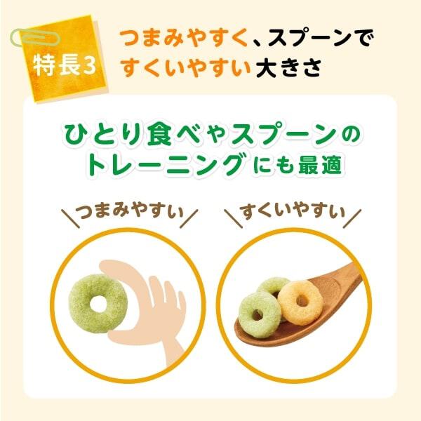 にんじん・トマト・かぼちゃ・パプリカパフ(米粉(米(国産))、オーツ麦粉、水溶性食物繊維、にんじん粉末、砂糖、トマト粉末、かぼちゃ粉末、パプリカ粉末)、ヨーグルト・いちごパフ(米粉(米(国産))、オーツ麦粉、砂糖、ヨーグルト粉末、水溶性食物繊維、いちご果汁粉末、殺菌乳酸菌粉末)/炭酸カルシウム、酸化防止剤(ビタミンE)、ピロリン酸鉄、(一部に乳成分・大豆を含む)
