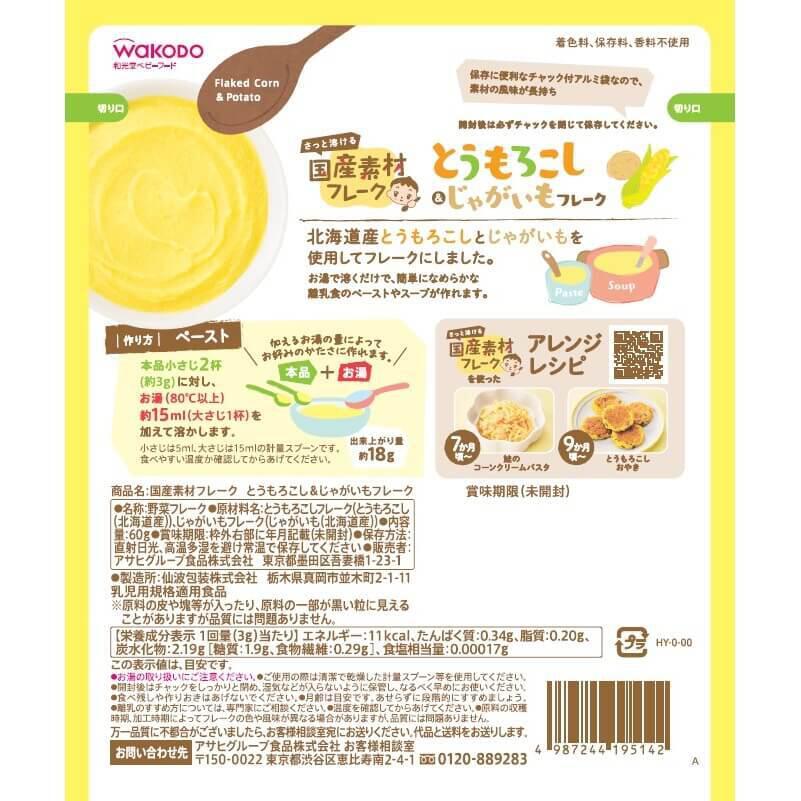 国産(北海道産)のとうもろこしとじゃがいもをそのままフレーク。お湯を溶くだけで簡単にペーストが作れます。