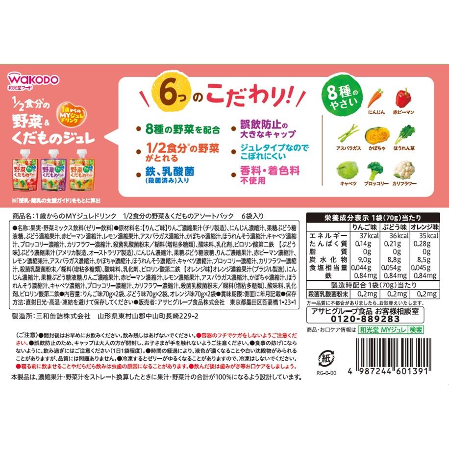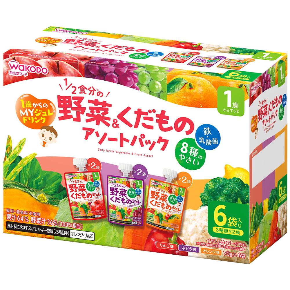 3種類のフレーバーが2個ずつ入ったお買い得パック。手軽に1/2食分の野菜がとれる、1歳からのお子さまが自分で飲みやすいジュレタイプ飲料です。8種の野菜と3種のくだもの入り。鉄・乳酸菌入り。