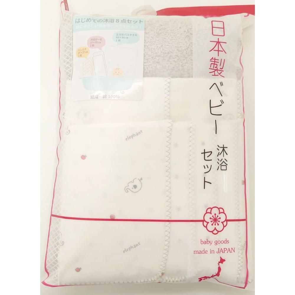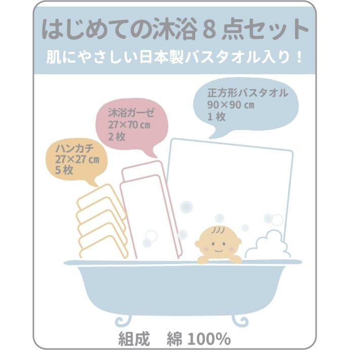 はじめての沐浴におすすめの、日本製バスタオル入り沐浴ガーゼ8点セットです。