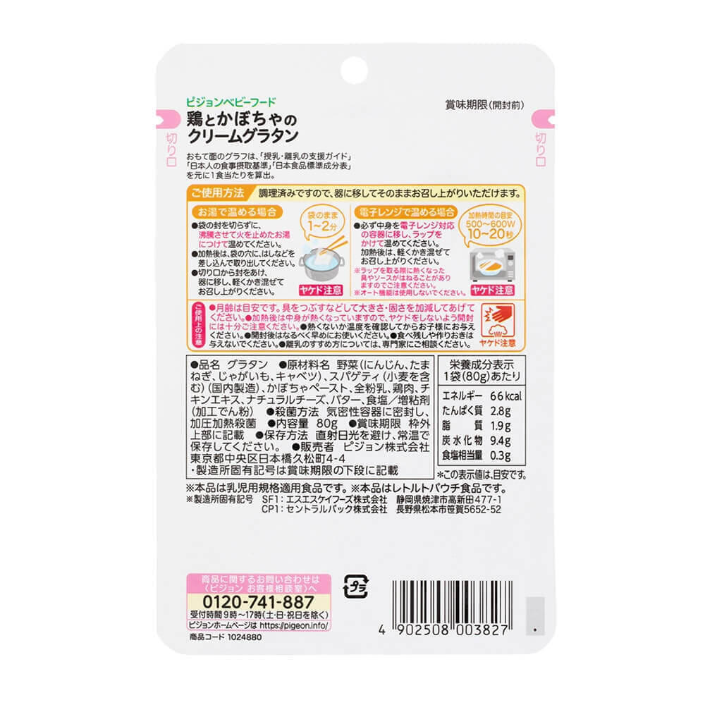 野菜(にんじん、たまねぎ、じゃがいも、キャベツ)、スパゲティ(小麦を含む)(国内製造)、かぼちゃペート、全粉乳、鶏肉、チキンエキス、ナチュラルチーズ、バター、食塩/増粘剤(加工でん粉)
