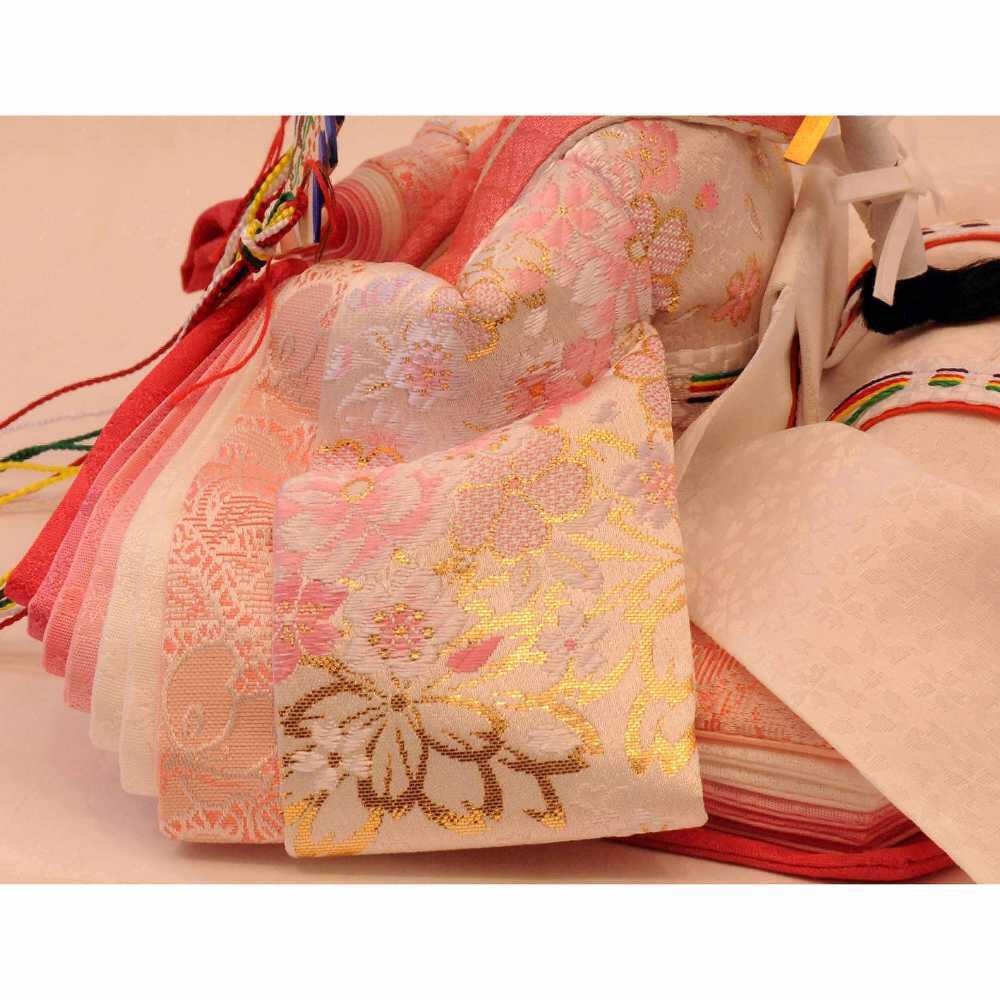 屏風や収納箱、雪洞は上品なパールホワイトで統一し、お人形の衣装やお道具は可愛らしいパステルカラーで合わせました。屏風と収納箱の幕板には華やかな桜を織り出しました。