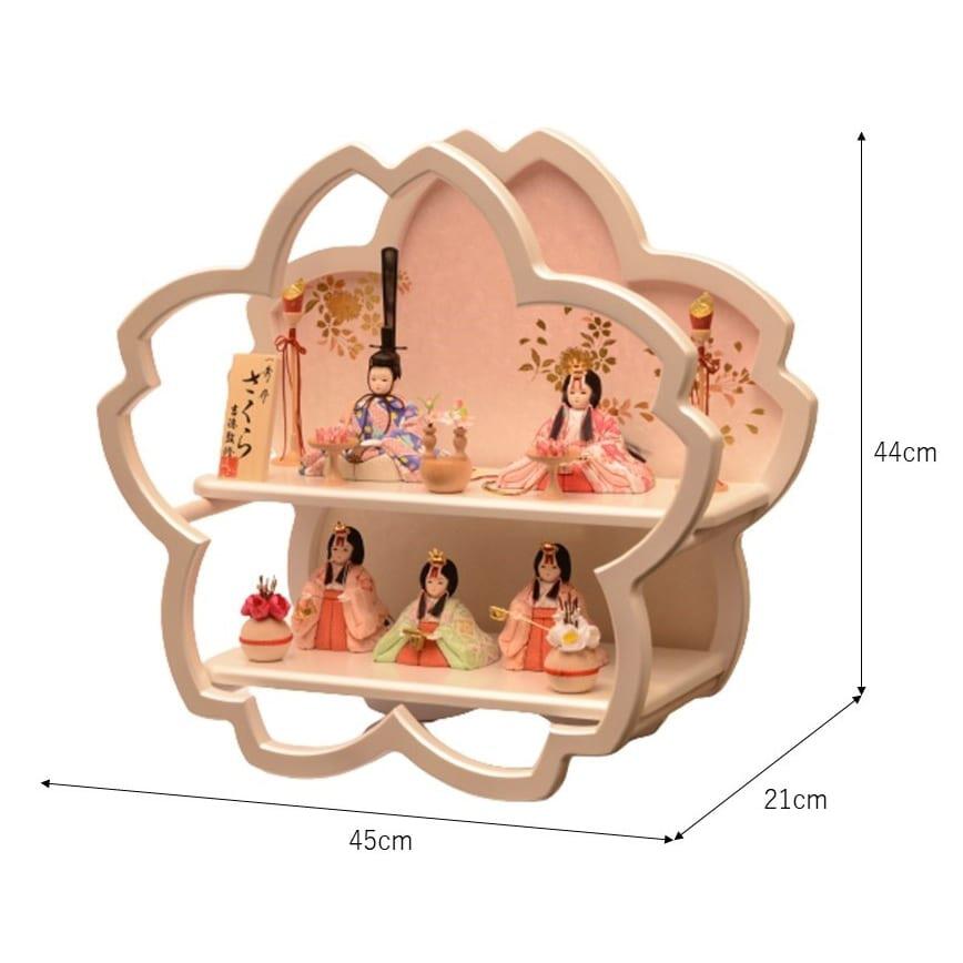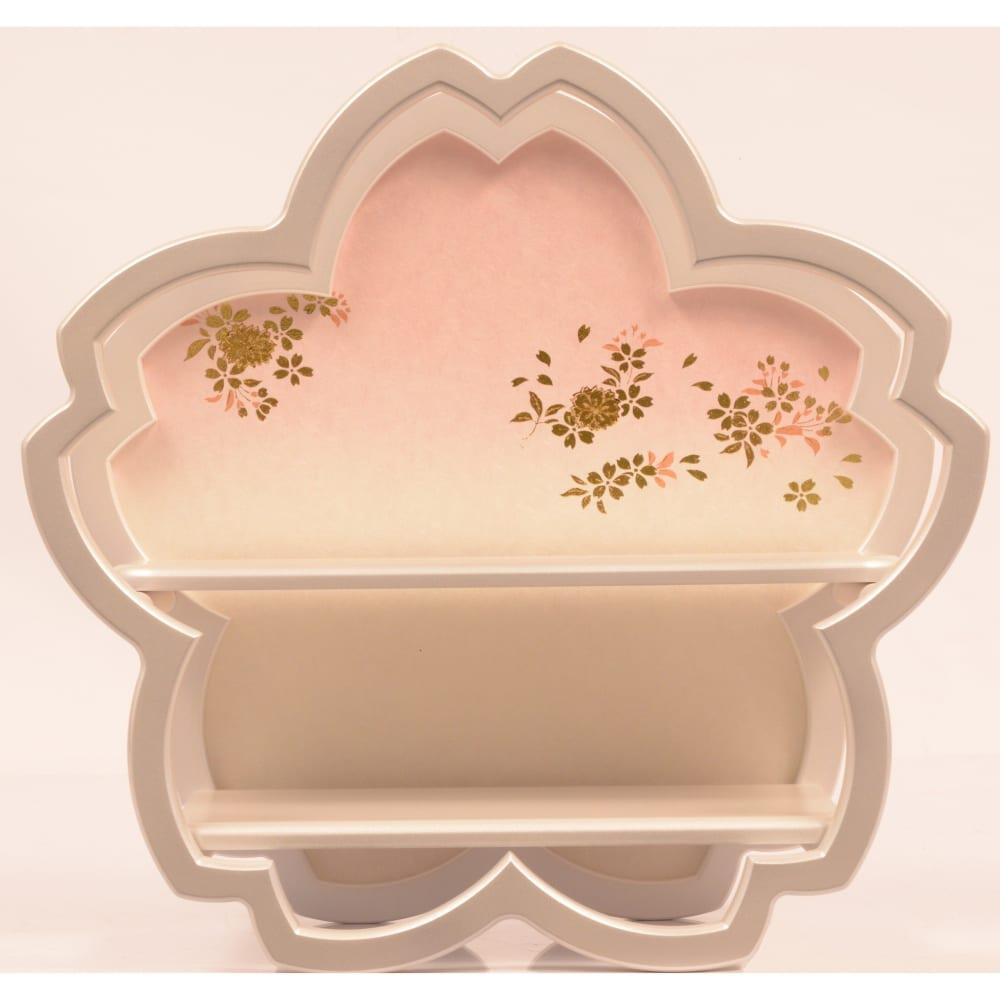 優しい表情のお人形が可愛らしい木目込み五人飾りです。飾り台はパールホワイトの花形で、背景には上品な金彩の桜を描きました。桜をモチーフにした幻想的なデザインです。