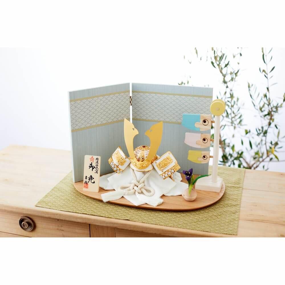 <セット内容>兜1点、屏風1点、積み木鯉1点、菖蒲1点、飾り台1点、木札1点