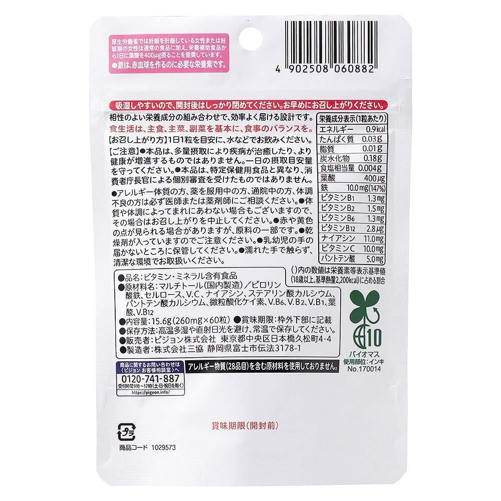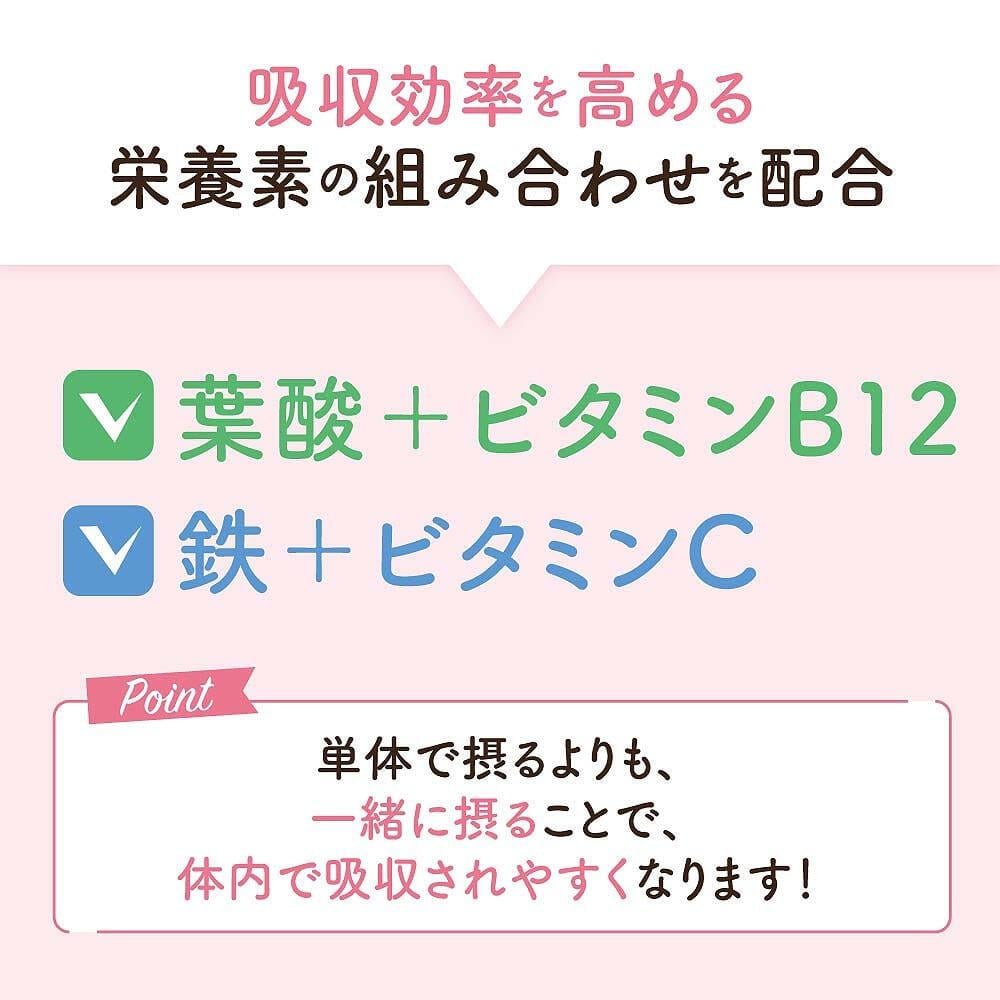 ●葉酸とビタミンB12、鉄とビタミンCの、吸収効率を高める組み合わせで配合。