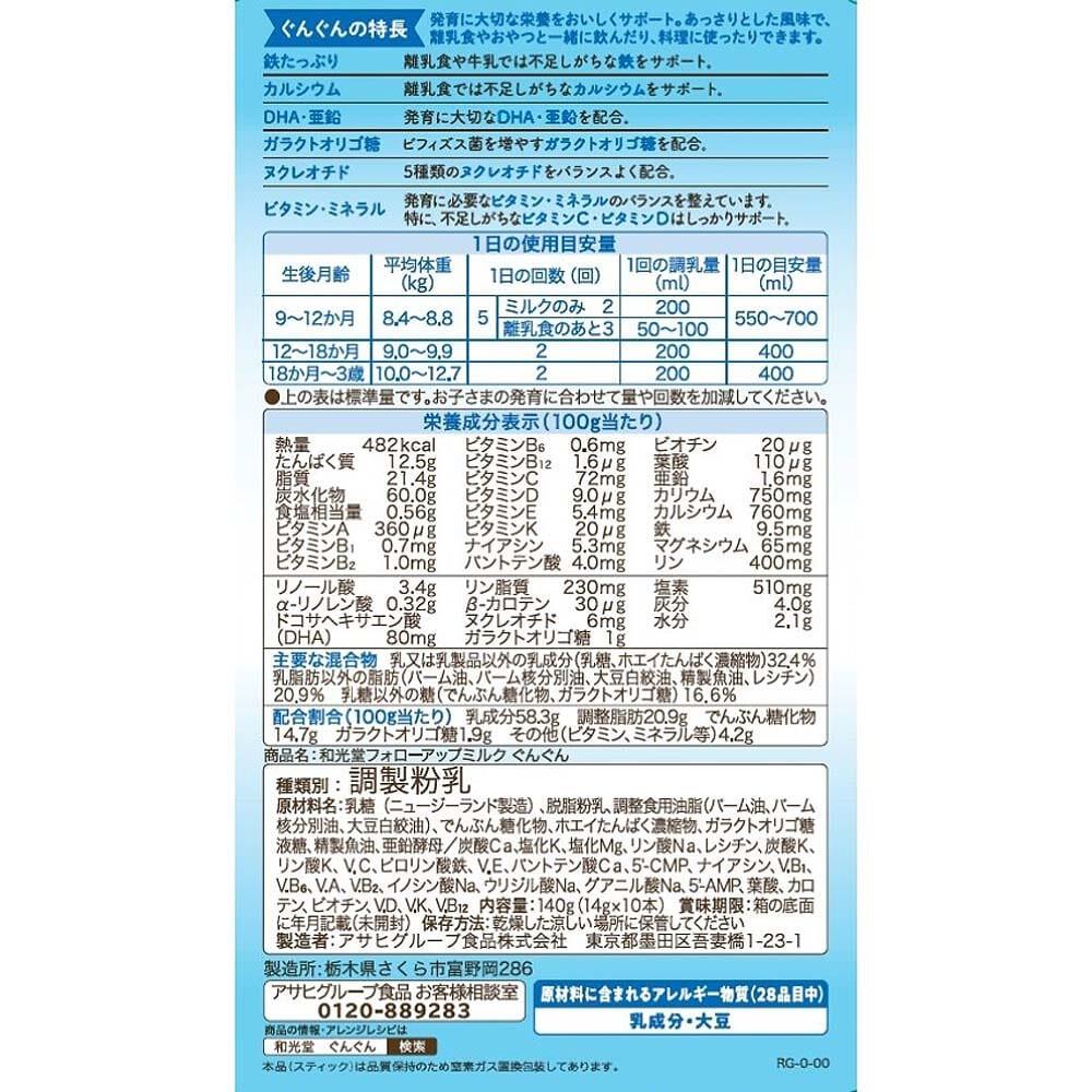 乳糖(ニュージーランド製造)、脱脂粉乳、調整食用油脂(パーム油、パーム核分別油、大豆白絞油)、でんぷん糖化物、ホエイたんぱく濃縮物、ガラクトオリゴ糖液糖、精製魚油、亜鉛酵母/炭酸Ca、塩化K、塩化Mg、リン酸Na、レシチン、炭酸K、リン酸K、V.C、ピロリン酸鉄、V.E、パントテン酸Ca、5'-CMP、ナイアシン、V.B1、V.B6、V.A、V.B2、イノシン酸Na、ウリジル酸Na、グアニル酸Na、5'-AMP、葉酸、カロテン、ビオチン、V.D、V.K、V.B12