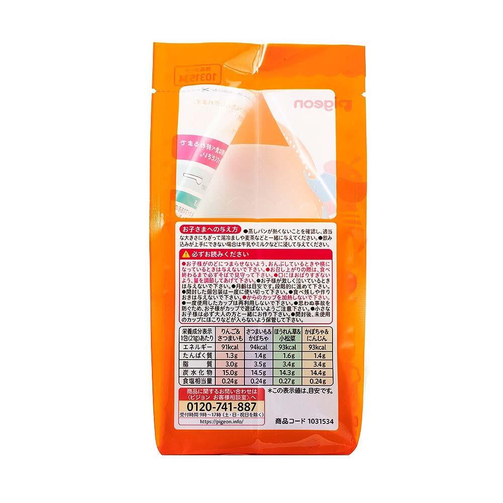 野菜粉末(さつまいも、かぼちゃ、グリンピース、ほうれん草、小松菜、にんじん)、りんご果汁粉末、小麦でん粉(国内製造)、砂糖、粉末油脂(植物油脂、コーンシロップ)、小麦粉、脱脂粉乳 、マルトデキストリン、卵黄粉末(卵を含む)、卵白粉末、食物繊維/加工でん粉、食塩、膨張剤、膨張剤、増粘剤(グァー)、乳化剤(大豆由来)、カゼインナトリウム、酸化防止剤(ビタミンC、ビタミンE)、香料