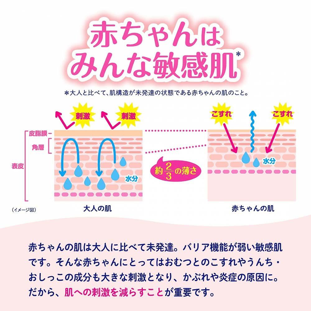 GOO.Nプラスは肌に対する刺激と感想に着目した敏感肌設計※おむつです。(※「敏感肌設計」とは、大人よりも敏感な赤ちゃんの肌を考えたおむつです。)