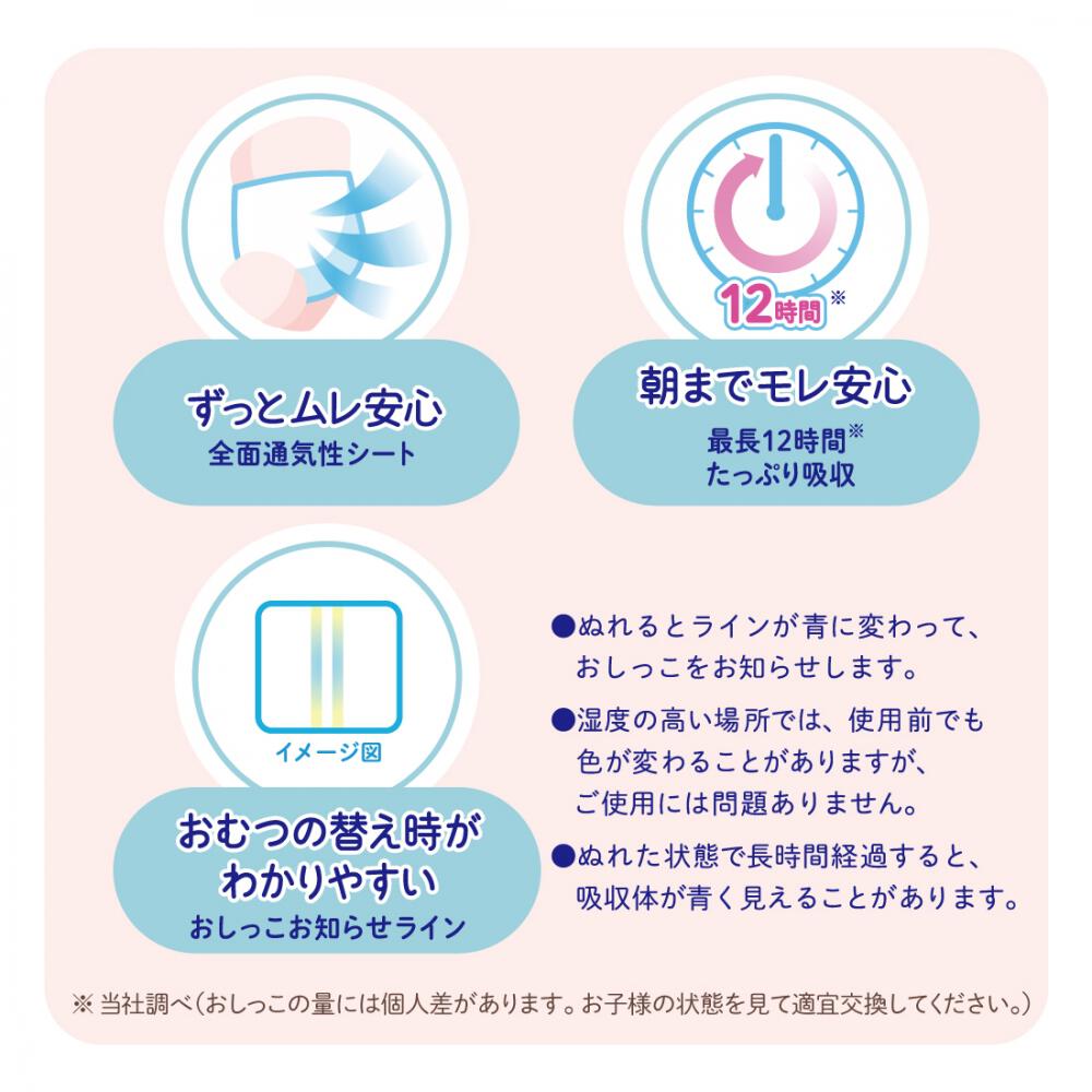 やわらかフィットプラス。おなかのかたちに合わせてやさしくフィット。おむつの跡がつきにくく、モレもしっかり防ぎます。