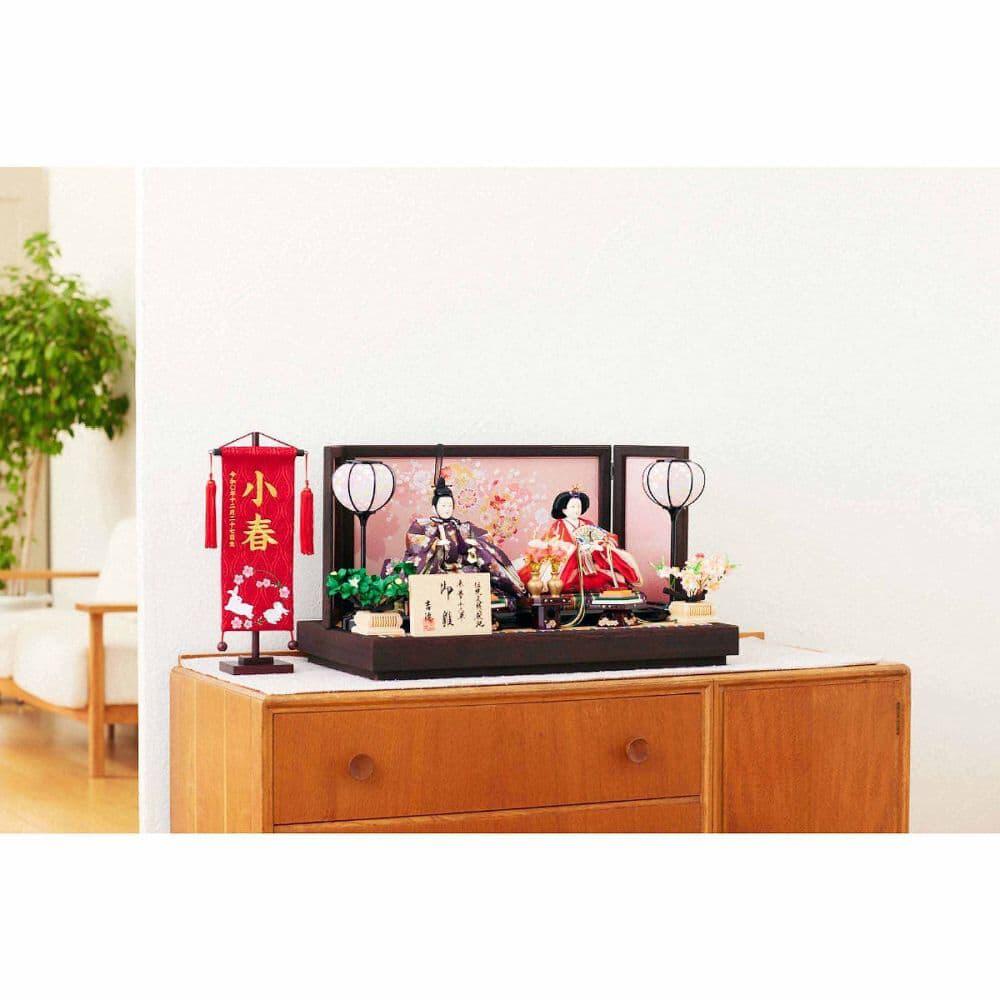桜模様の衣装のお人形と雪輪と花々を織り出しクリスタルを散りばめた屏風がセットになった、春の温かみを感じられる衣装着親王飾りです。