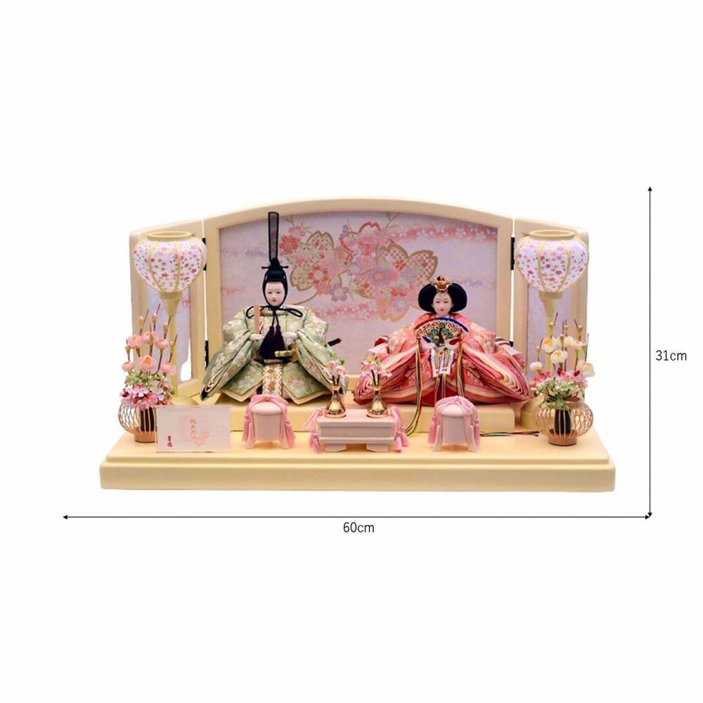 桜の花を折り込んだ可愛らしい生地を屏風に使用しました。お人形の衣装にも桜の花が施されている親王飾りです。
