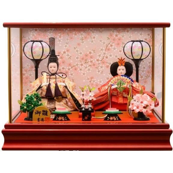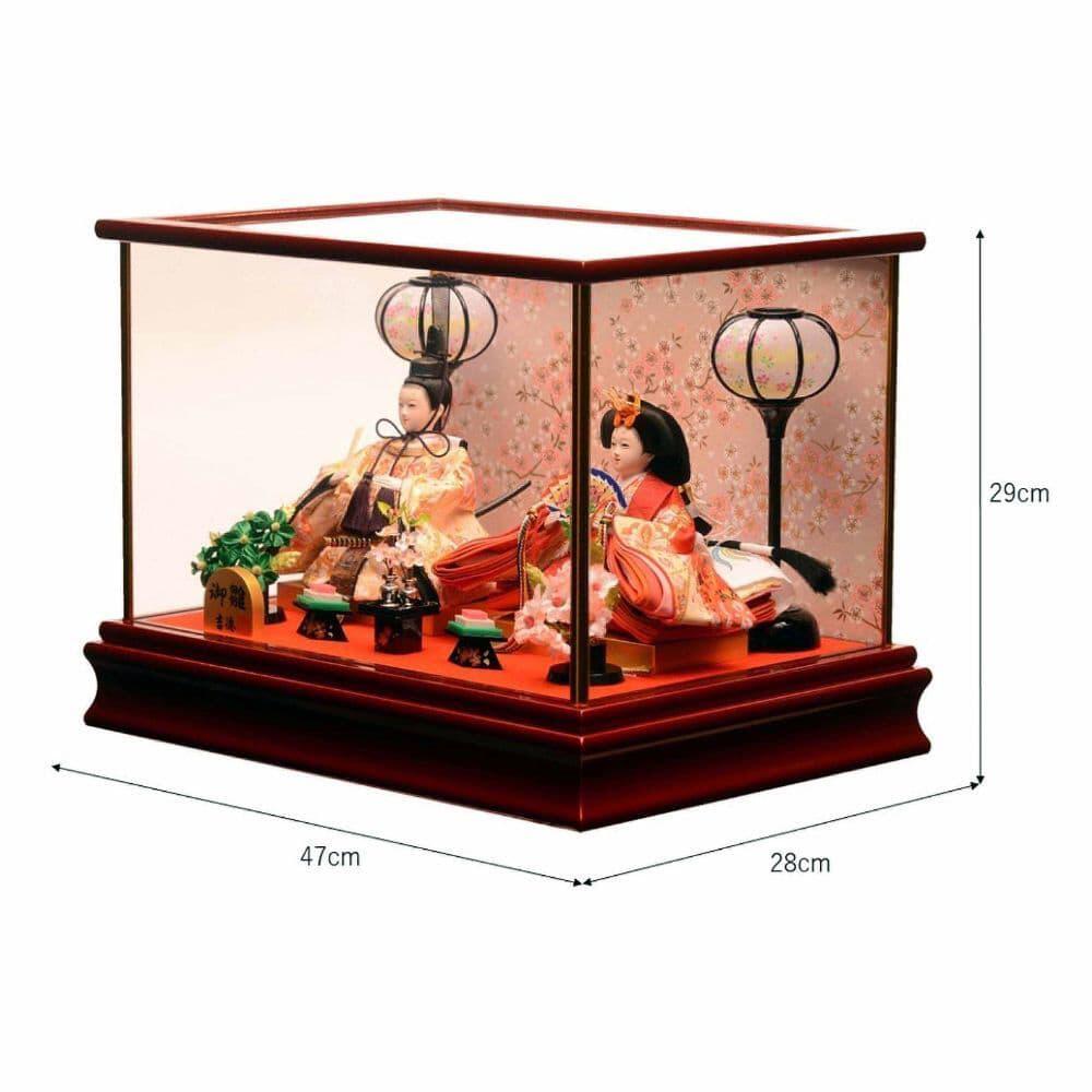 <セット内容>人形(2人)一式、ガラスケース1点、雪洞1対、桜橘1点、道具(2点)一式、親王台1対、木札1点