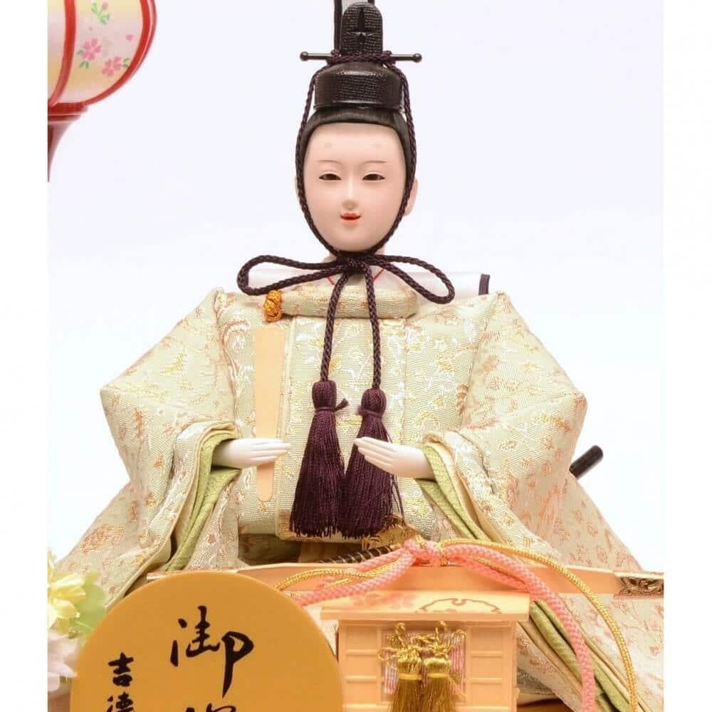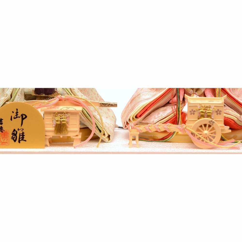 <セット内容>人形(2人)一式、アクリルケース1点、雪洞1対、桜橘1点、道具(2点)一式、親王台1対、木札1点