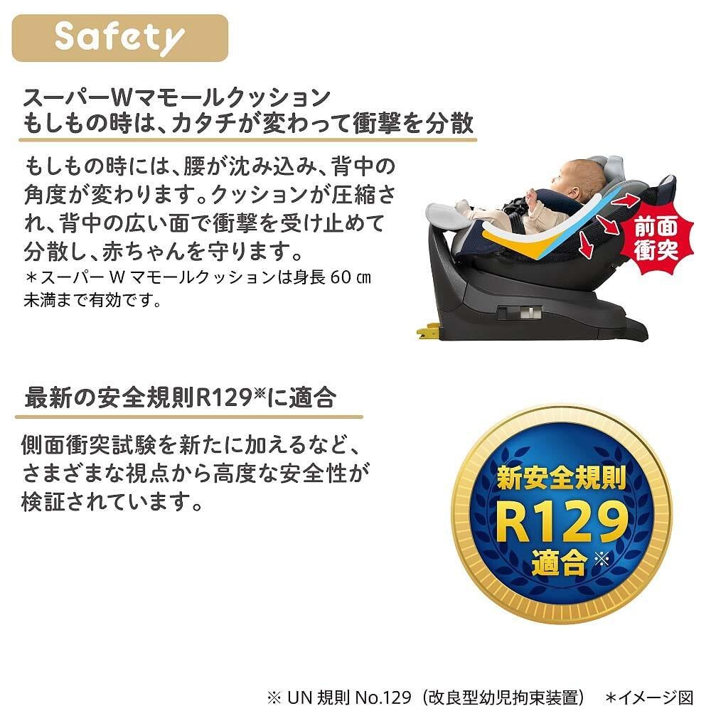 ●最新の安全規則R129(※1)に適合。側面衝突試験を新たに加えるなど、さまざまな視点から高度な安全性が検証されています。※1 UN規則No.129(改良型幼児拘束装置)