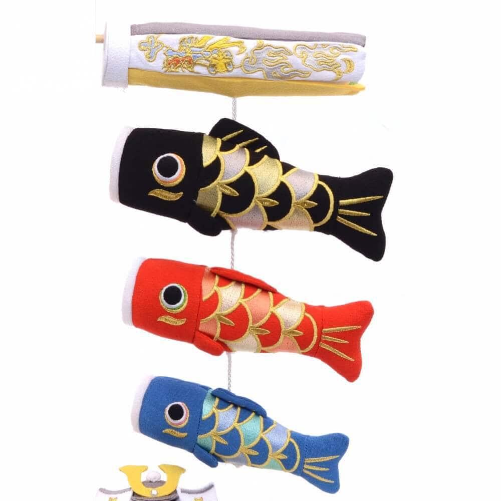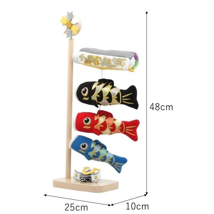 <セット内容>吹き流し1点・鯉3点(黒鯉・赤鯉・青鯉)・兜1点・飾り用スタンド(組み立て式)1点