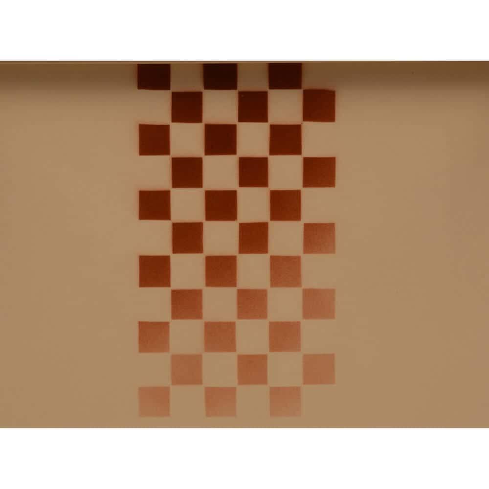 ベージュ色のケースに赤い市松柄の背景がモダンな印象を与えます。
