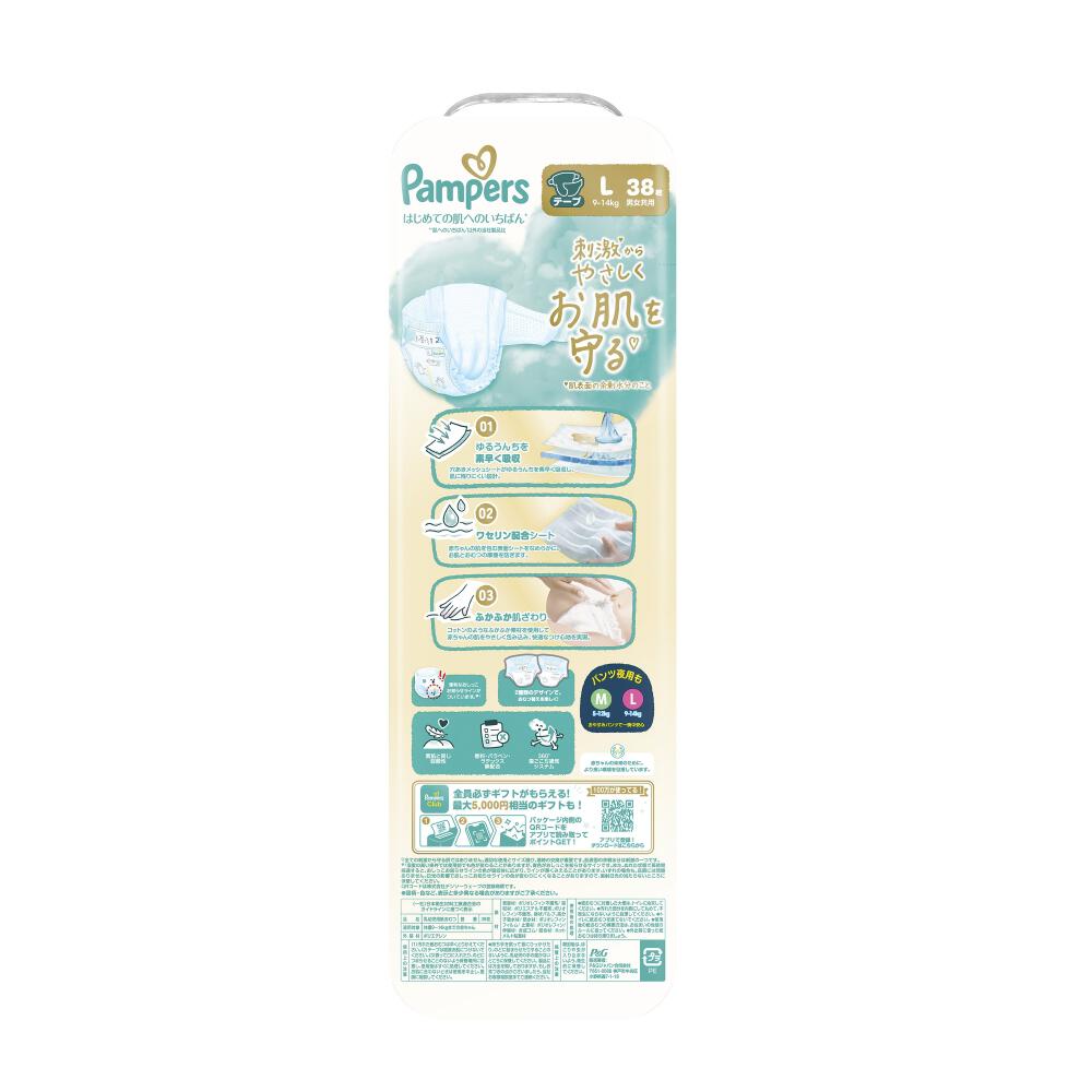 パンパースの上手なつけ方(ご使用前に必ずお読みください。)1. オムツを広げて、うんちガードを立てる。テープのついている方が背中側です。うんちガードがしっかり立っているか確認しながらあててください。2. サイドの伸び縮みする部分を適度に伸ばす。サイドの部分は伸び縮みするので、ぴったりフィットする程度にのばしても赤ちゃんをしめつけすぎる心配はありません。Point1 のばしたまま少しひっぱりぎみで。3. テープを受け部にとめる。テープは直接肌に当たらない位置にとめてください。 Point2 左右対称に貼ってください。4. 足回りとウエスト回りを整える。足回り、ウエスト回りが内側に折れているとモレの原因となります。Point3 ウエスト回りは、指が1本すっと入る程度が適当です。