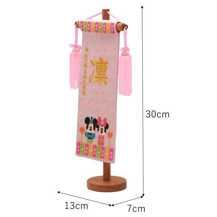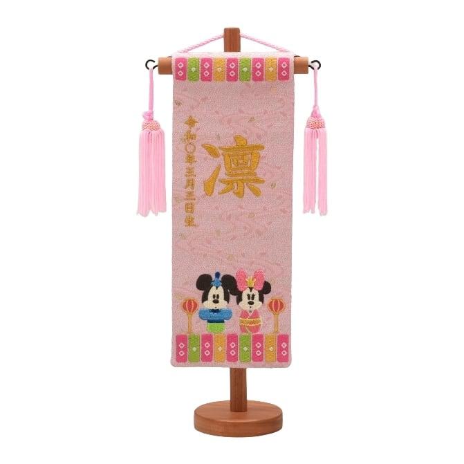 ミッキー&ミニーがお雛様になりました。うすいピンク色の名前旗。初節句のお祝いに。