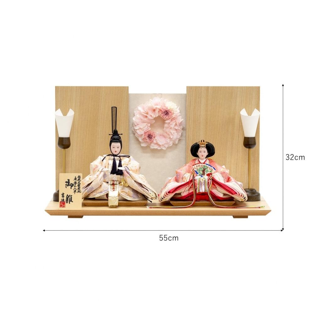 <セット内容>人形(2人)一式、屏風1点、フラワーリース1点、燭台1対、親王台1対、飾り台1点、木札1点