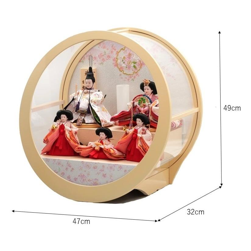クリームのアクリルケースに雪輪桜刺繍が施された背景の丸形のケース五人飾りです。