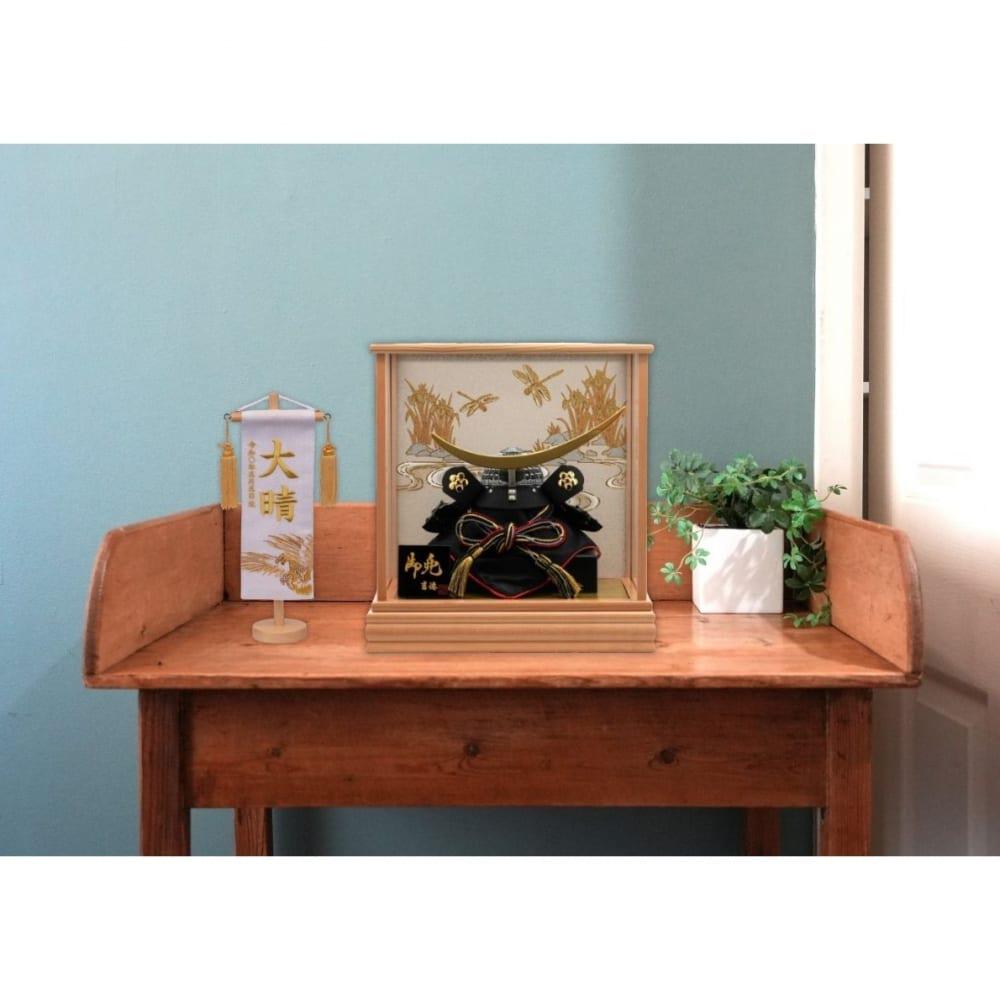 トイザらス・ベビーザらスがおすすめする『兜ケース飾り「伊達政宗流水にトンボ木目調」』の五月人形です。