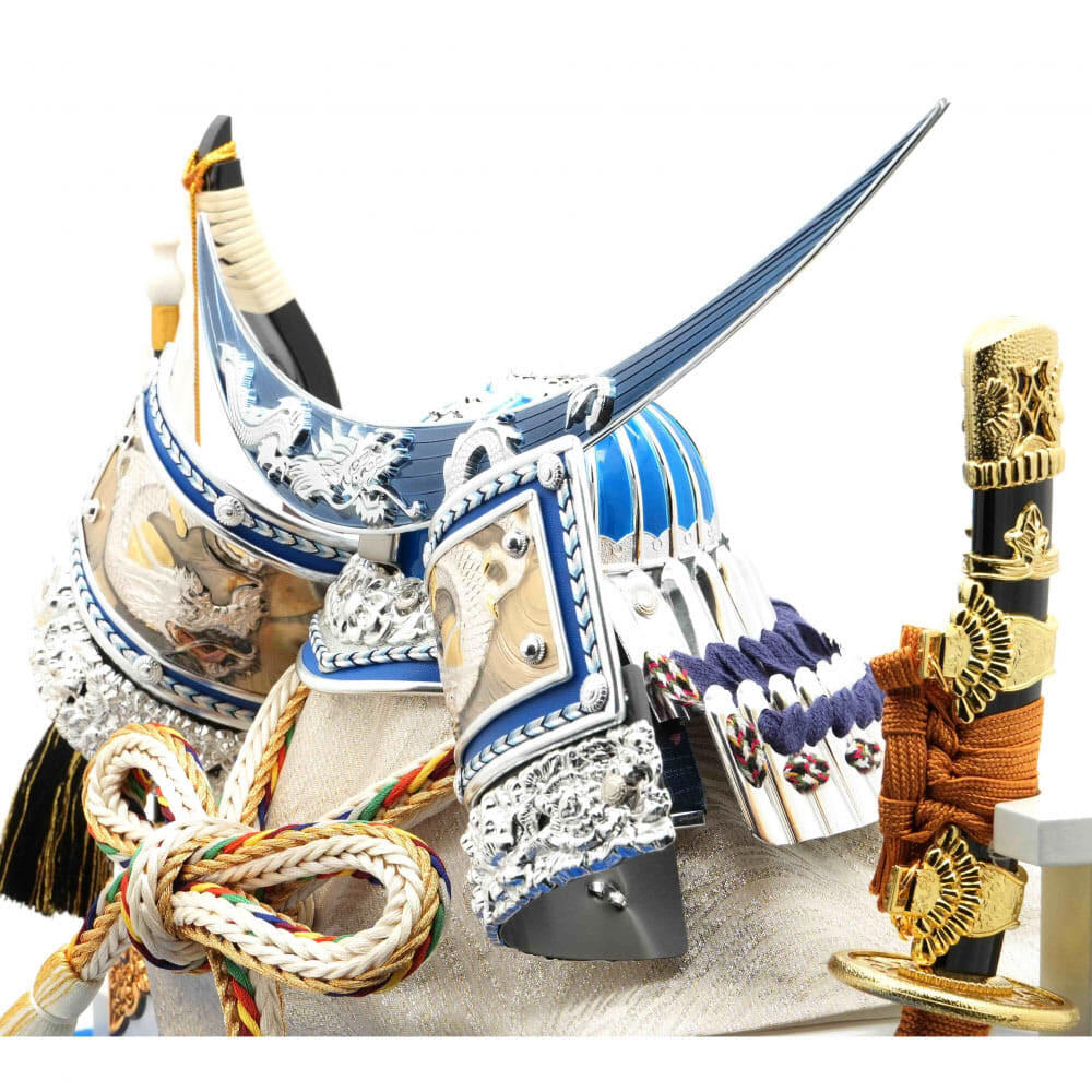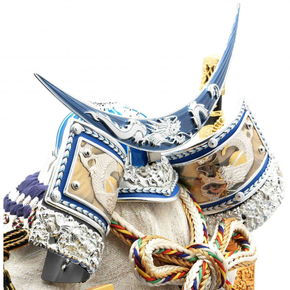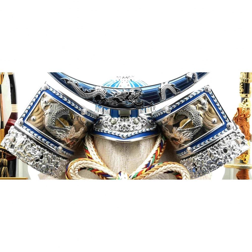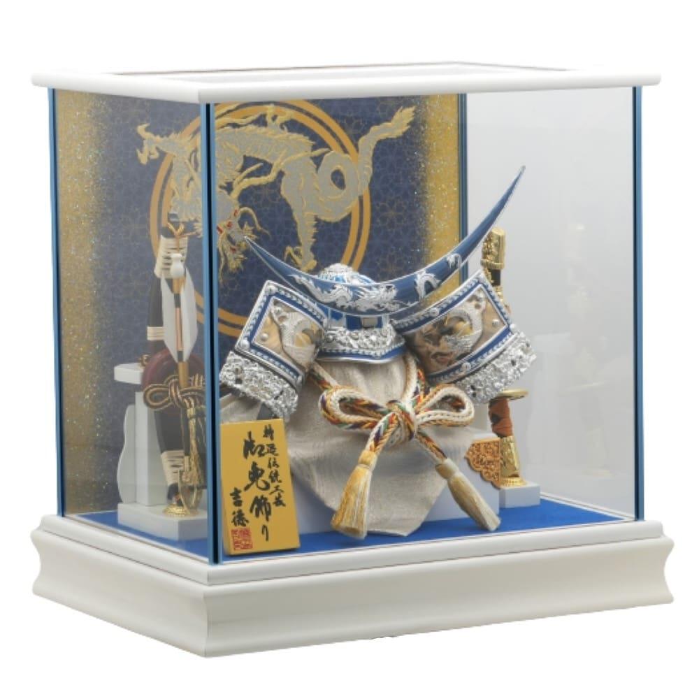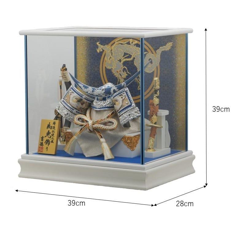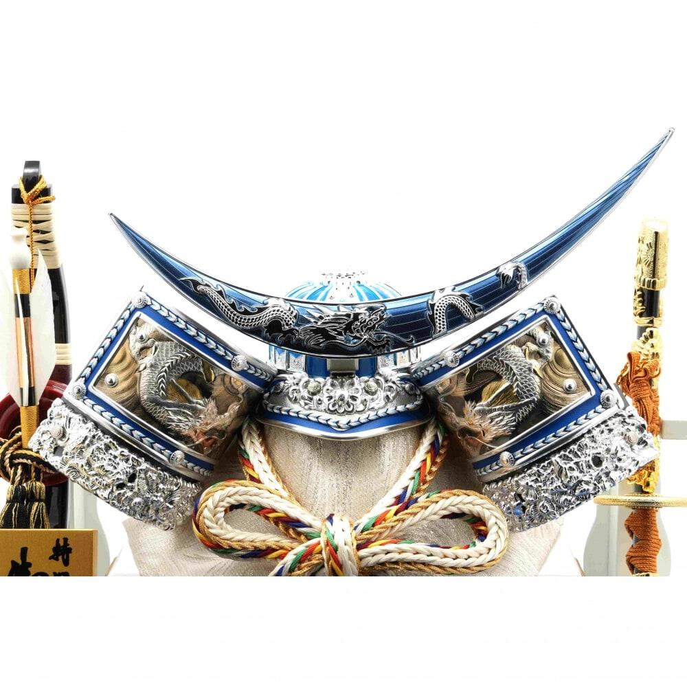 青を基調とした兜を背景に金彩で龍を描いた白塗に青メタリック柱のケースにセットしました。