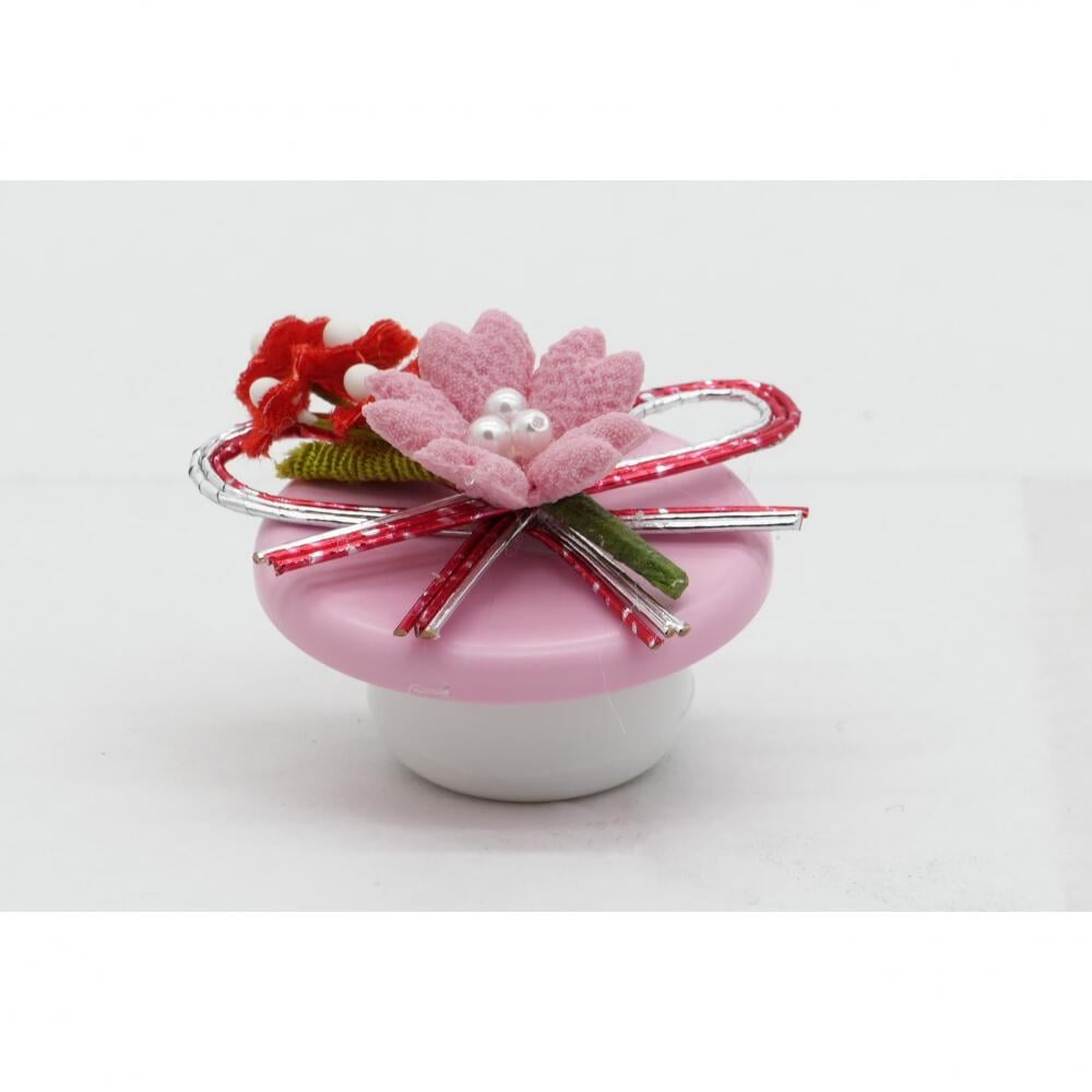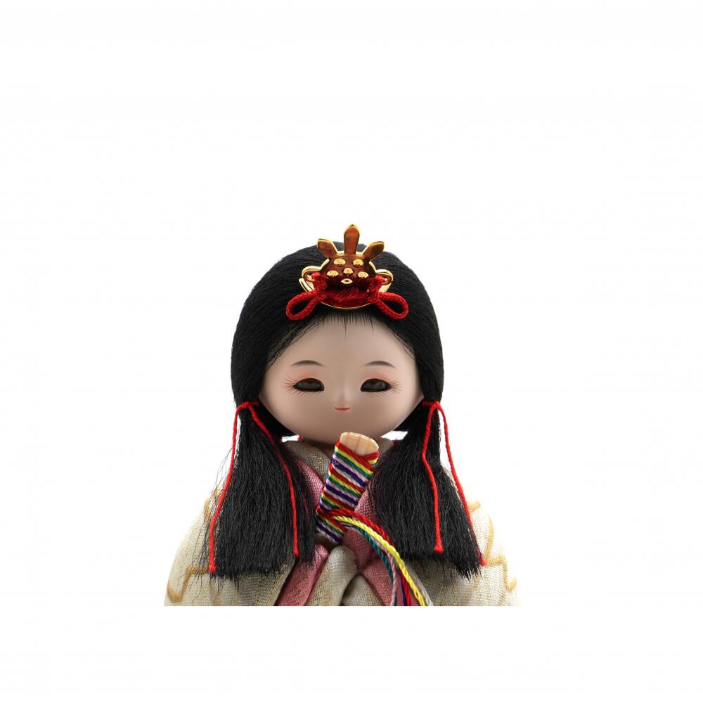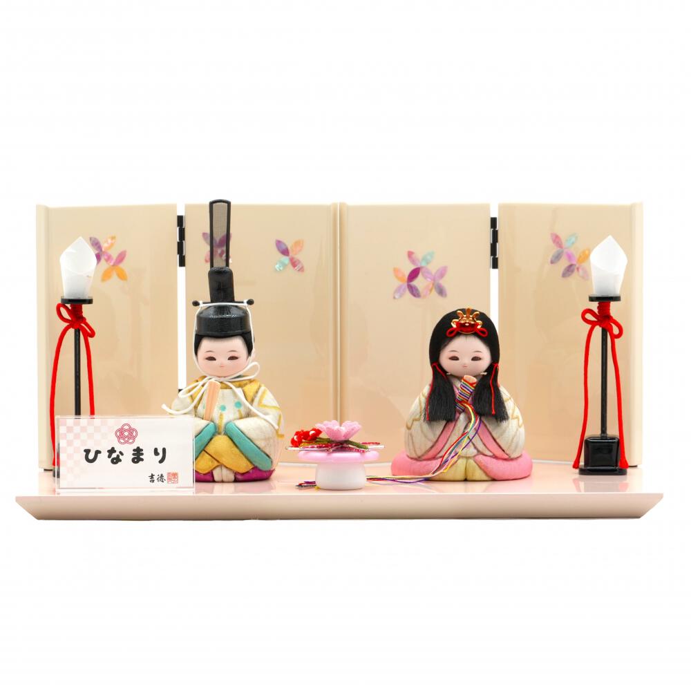 優しいお顔のお人形をバニラ塗に螺鈿細工を施した屏風にセットした可愛らしい木目込み飾りです。