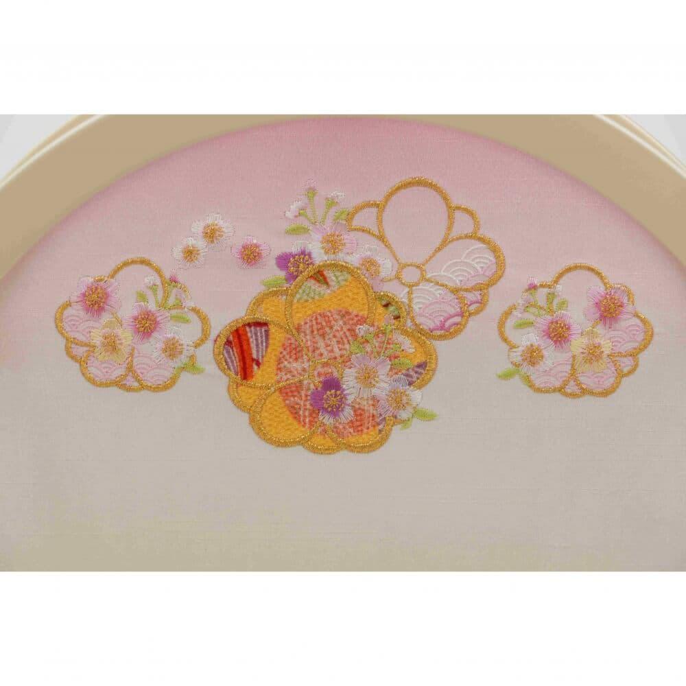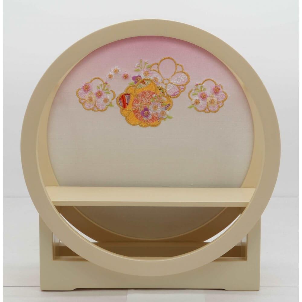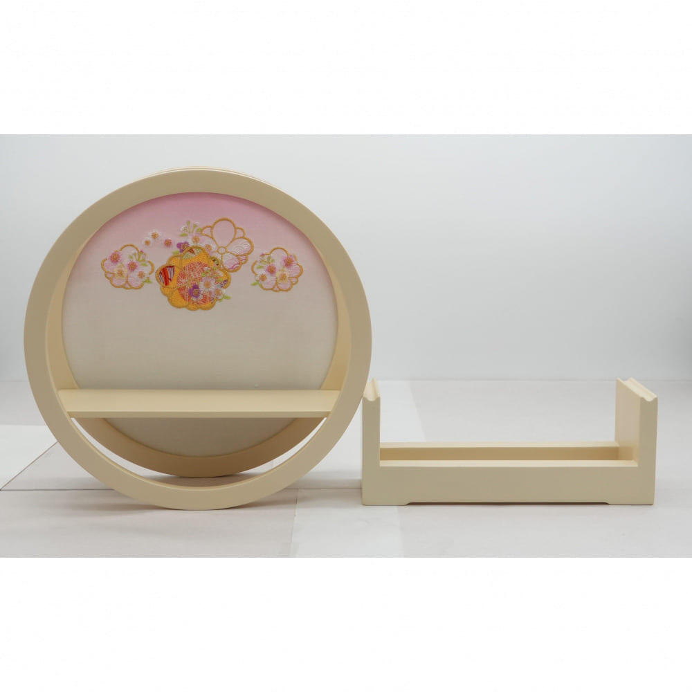 優しいお顔のお人形を刺繍を施した丸形の飾り台にセットした木目込み飾りです。