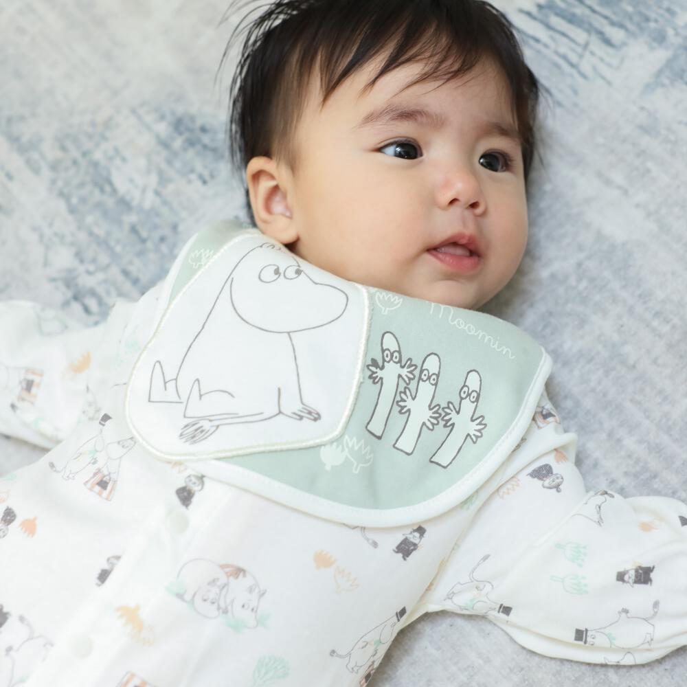 人気キャラクター、ムーミンのスタイ付き新生児兼用ドレスです。