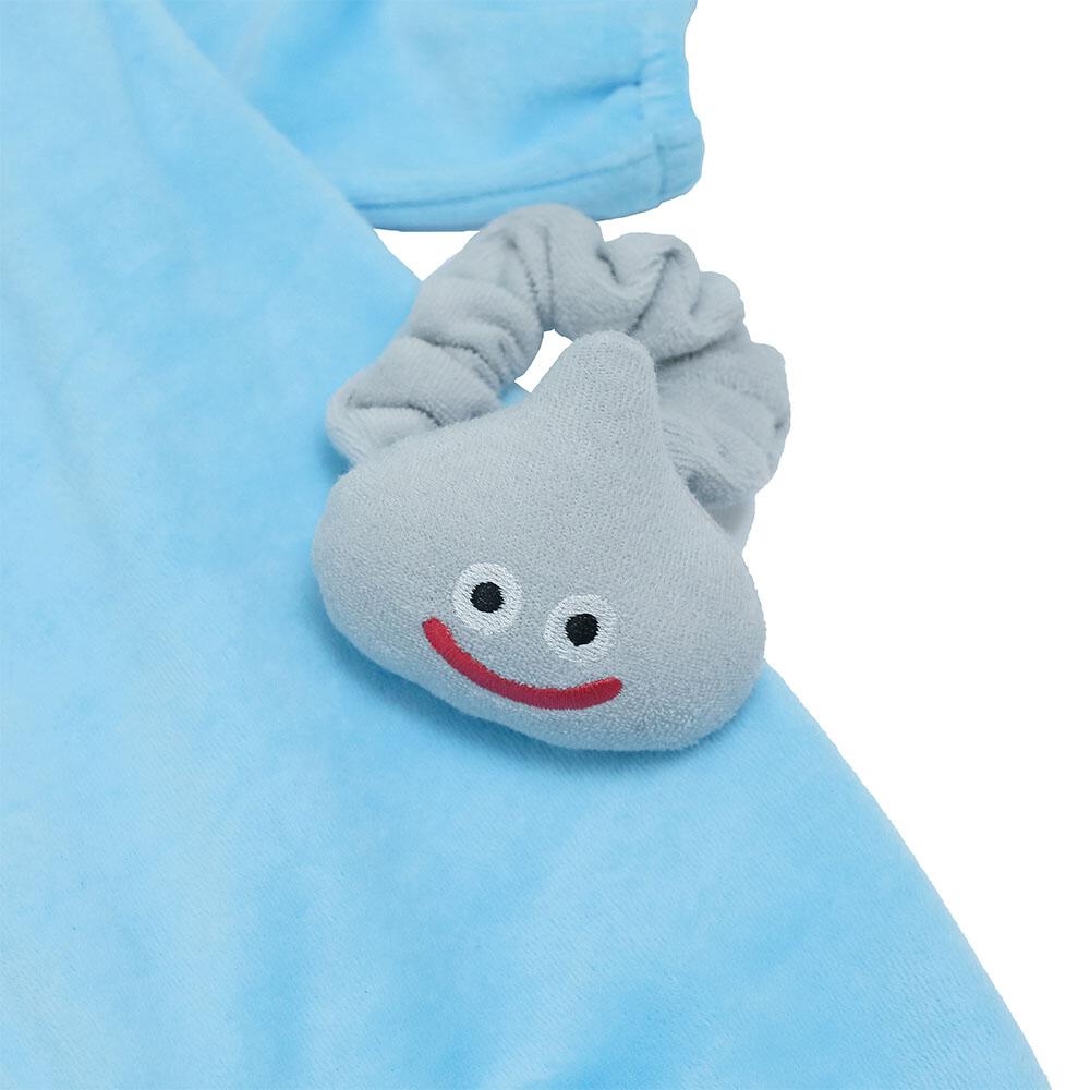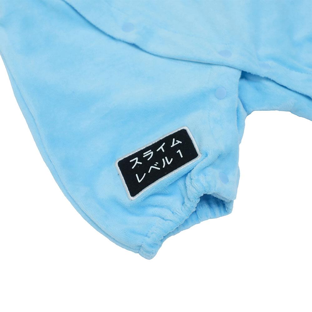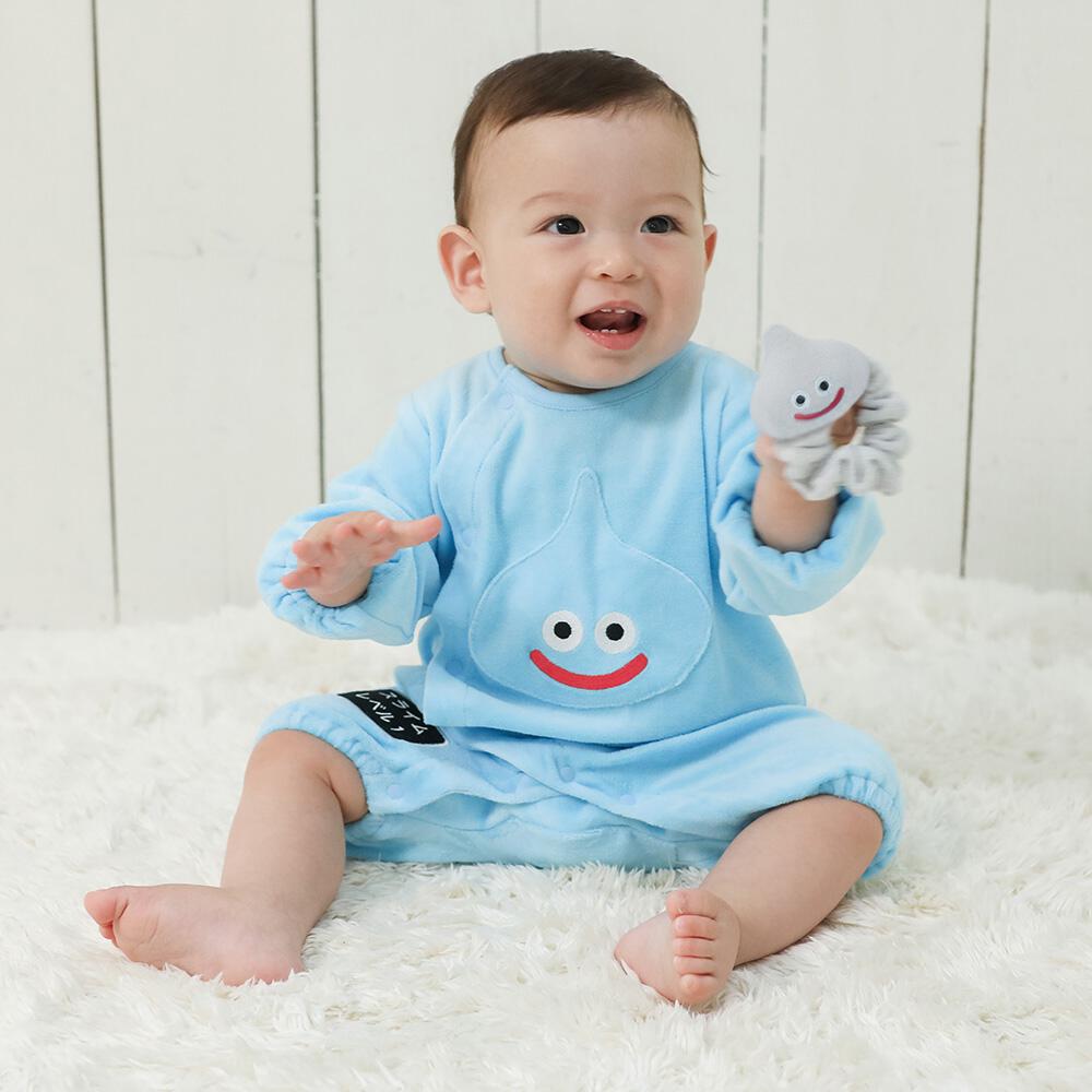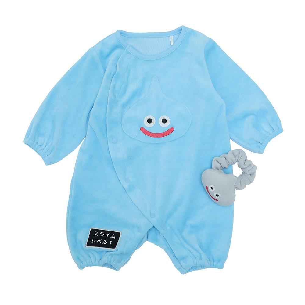 スライムがデザインされたベロア素材のフィットオールに、メタルスライムのラトル付きの商品です。
