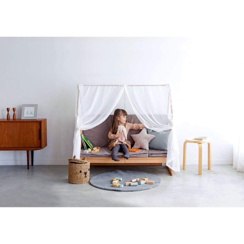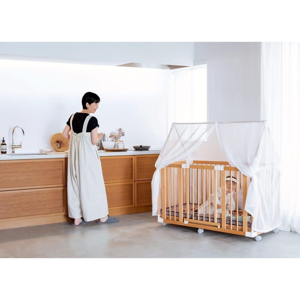 ・オプション品の利用で、荷物入れもベビーベッドの下に設けることが可能です。5in1機能以外にも、オプションパーツを利用することによって ベビーゲートやプレイルームにも変身し、成長とともにカタチを変えながらお楽しみいただけます。