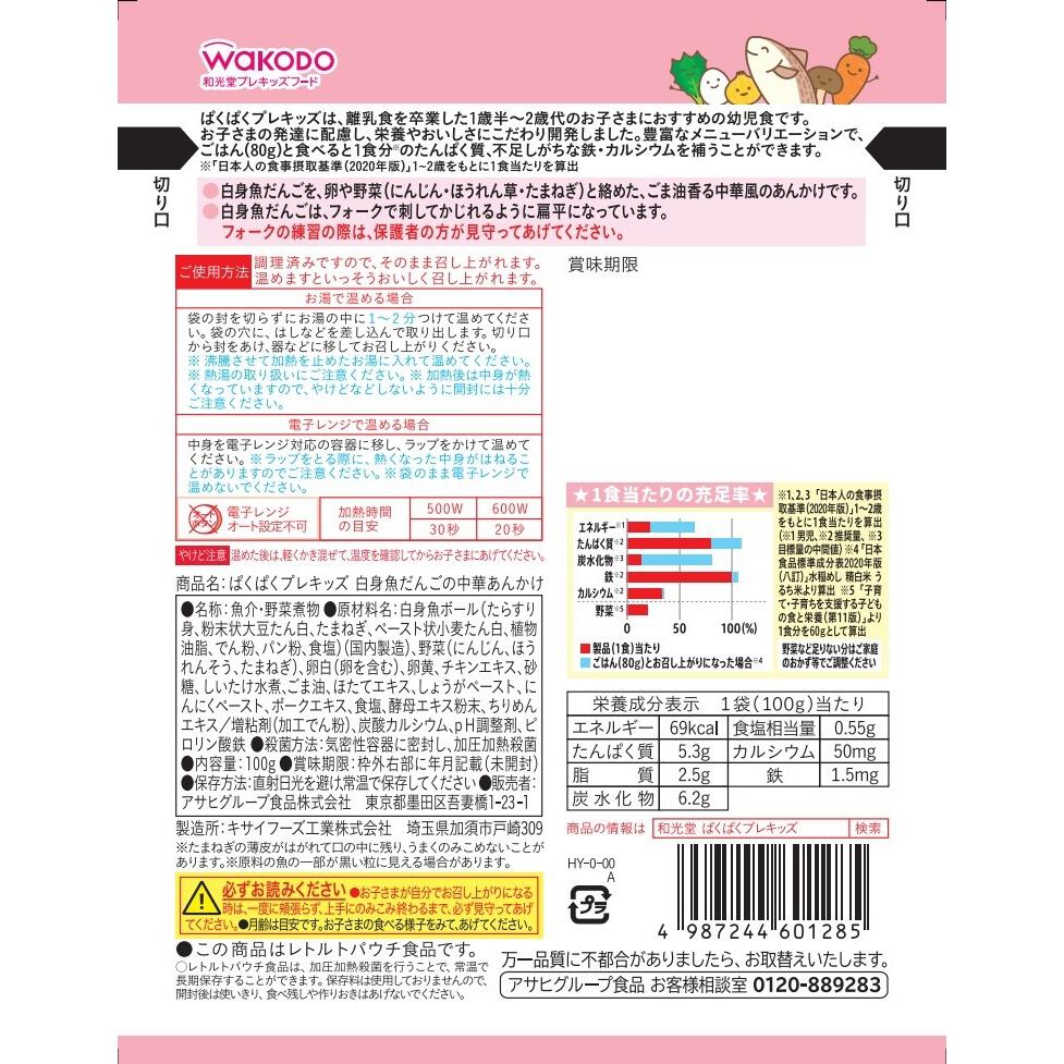 白身魚ボール(たらすり身、粉末状大豆たん白、たまねぎ、ペースト状小麦たん白、植物油脂、でん粉、パン粉、食塩)(国内製造)、野菜(にんじん、ほうれんそう、たまねぎ)、卵白(卵を含む)、卵黄、チキンエキス、砂糖、しいたけ水煮、ごま油、ほたてエキス、しょうがペースト、にんにくペースト、ポークエキス、食塩、酵母エキス粉末、ちりめんエキス/増粘剤(加工でん粉)、炭酸カルシウム、pH調整剤、ピロリン酸鉄