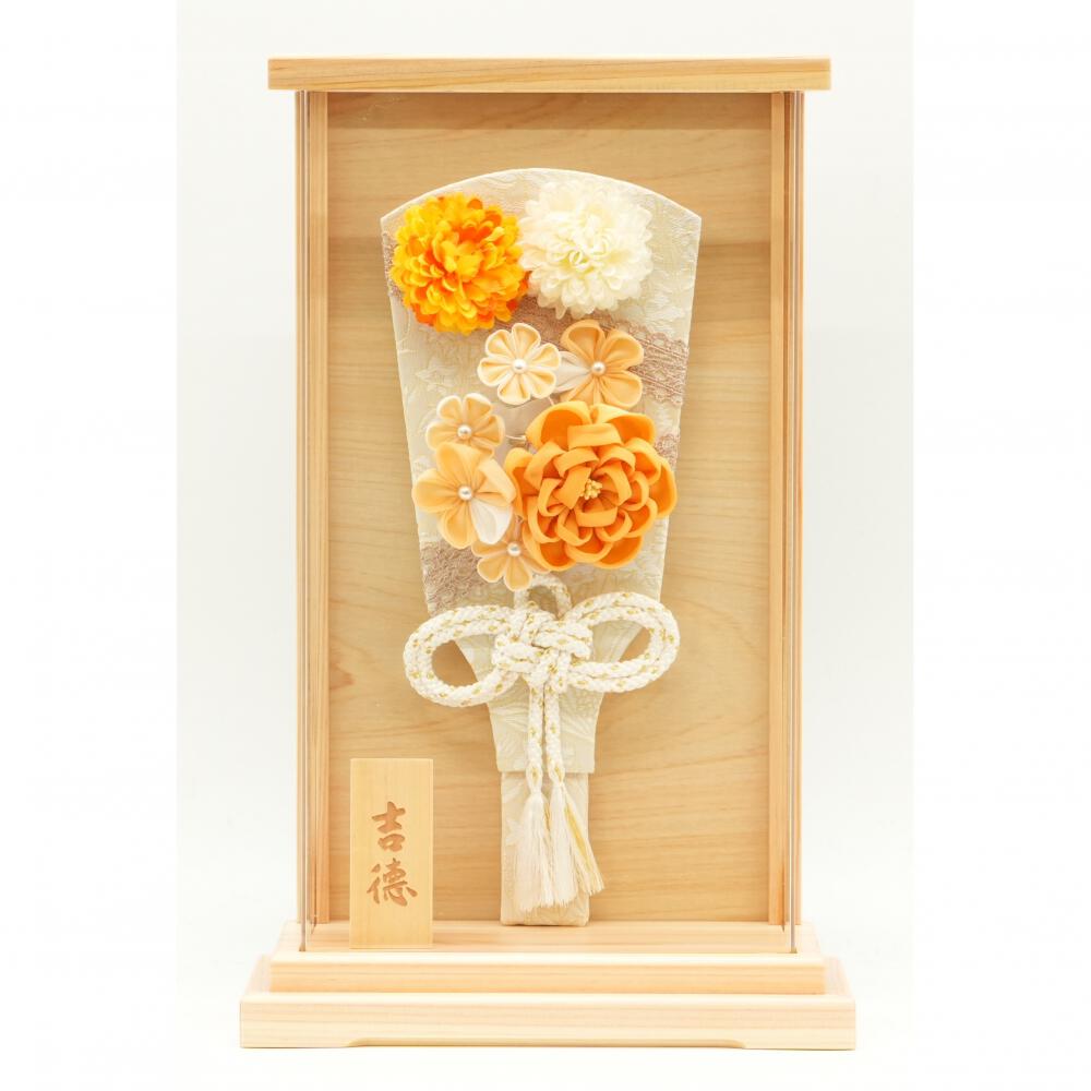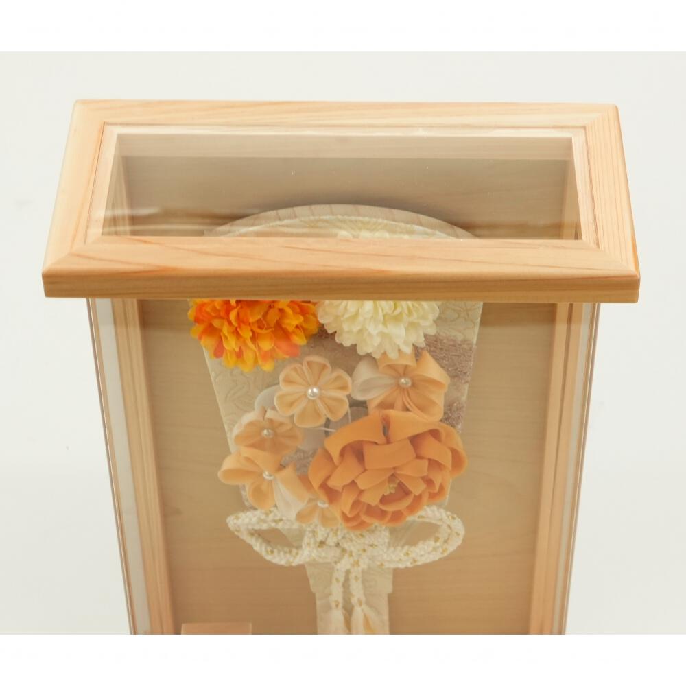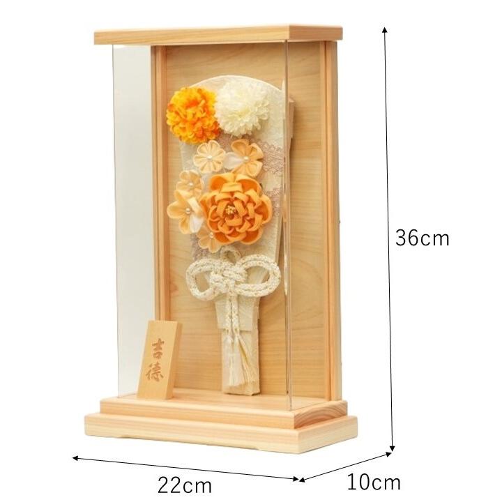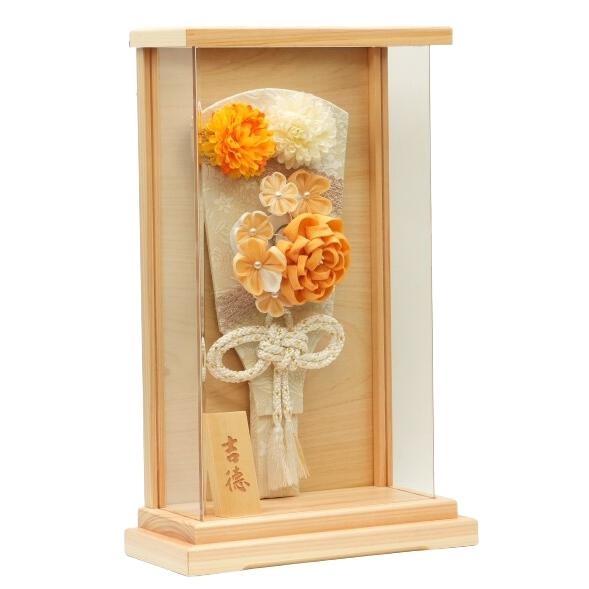 壁掛けとしてもお飾りいただける白木木目のアクリルケースに、つまみ細工を施した可愛らしい羽子板をセットした羽子板飾りです。