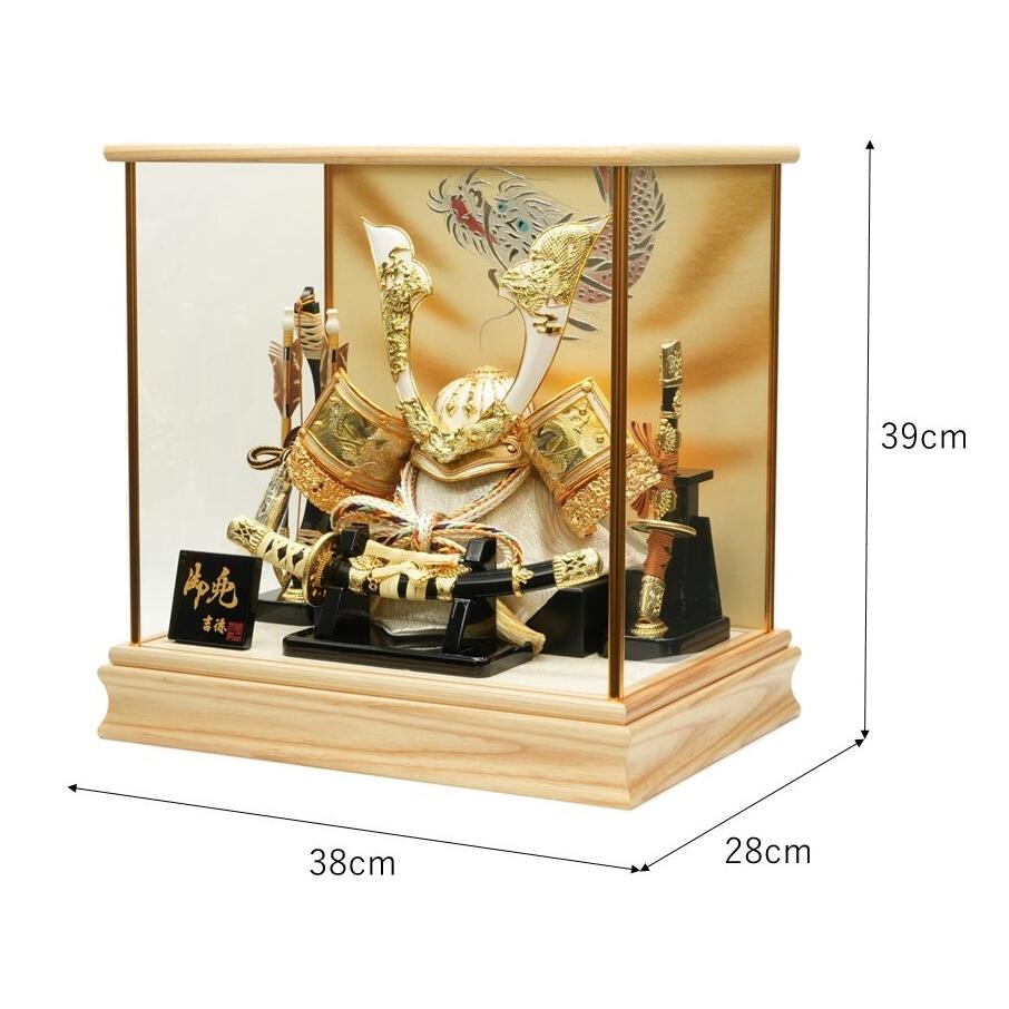 <セット内容>兜1点、ガラスケース1点、弓1点、太刀1点、前一本太刀、木札1点