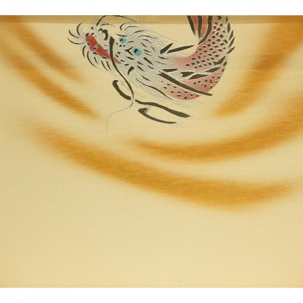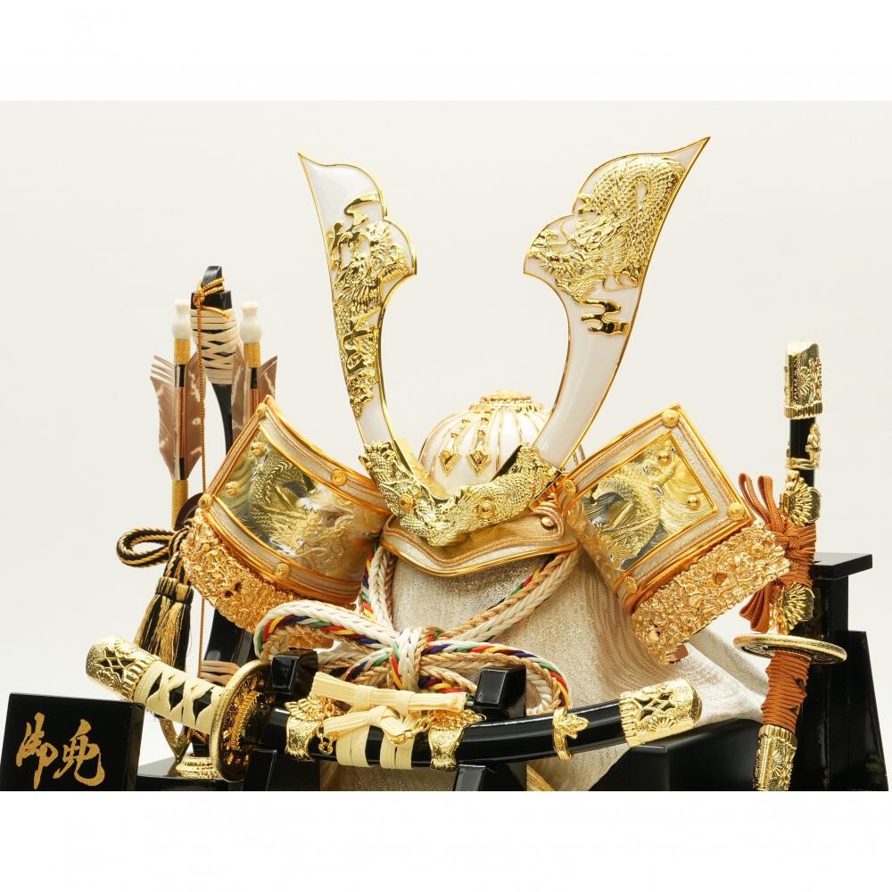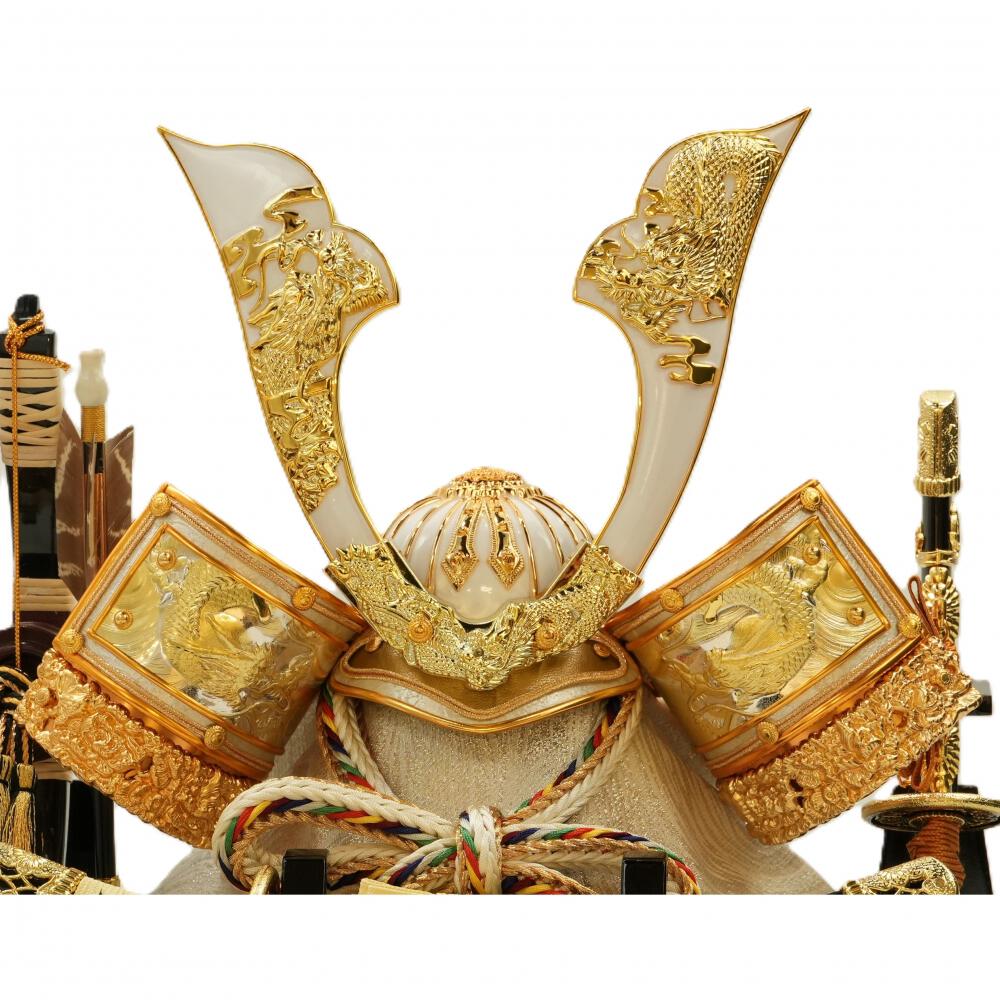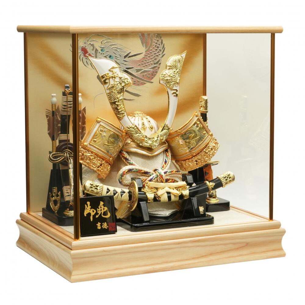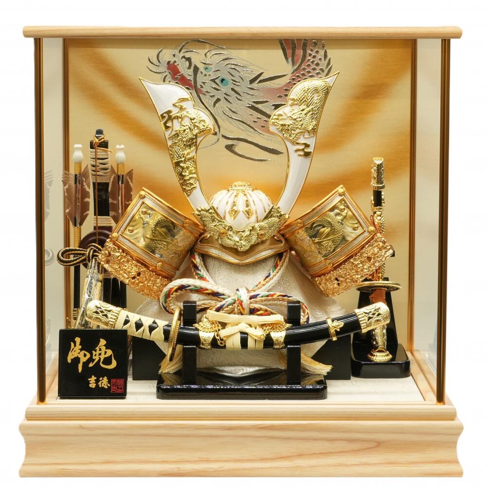 銀色の龍の背景のケースに龍をふんだんに施した白い兜をセットしました。