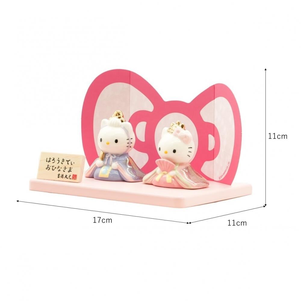 女雛キティと男雛ダニエルのコンパクトでキュートな磁器製ひな人形です。リボン型の屏風が仲睦まじい2人を引き立てます。
