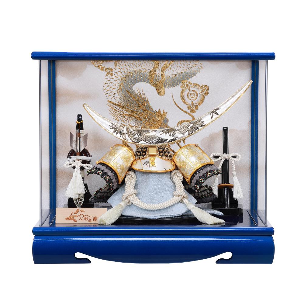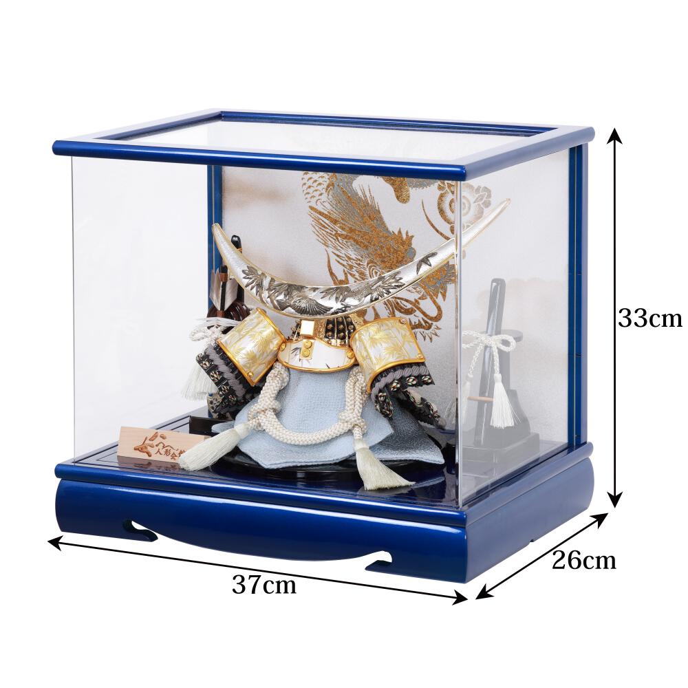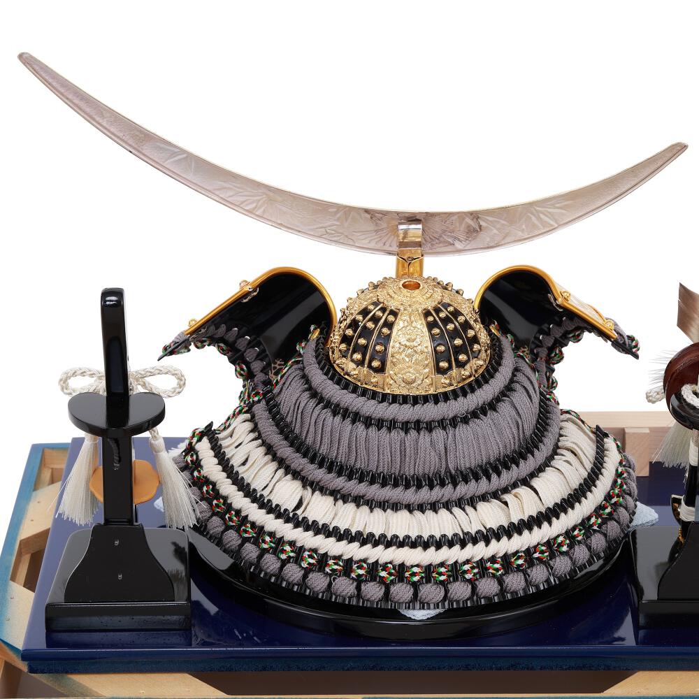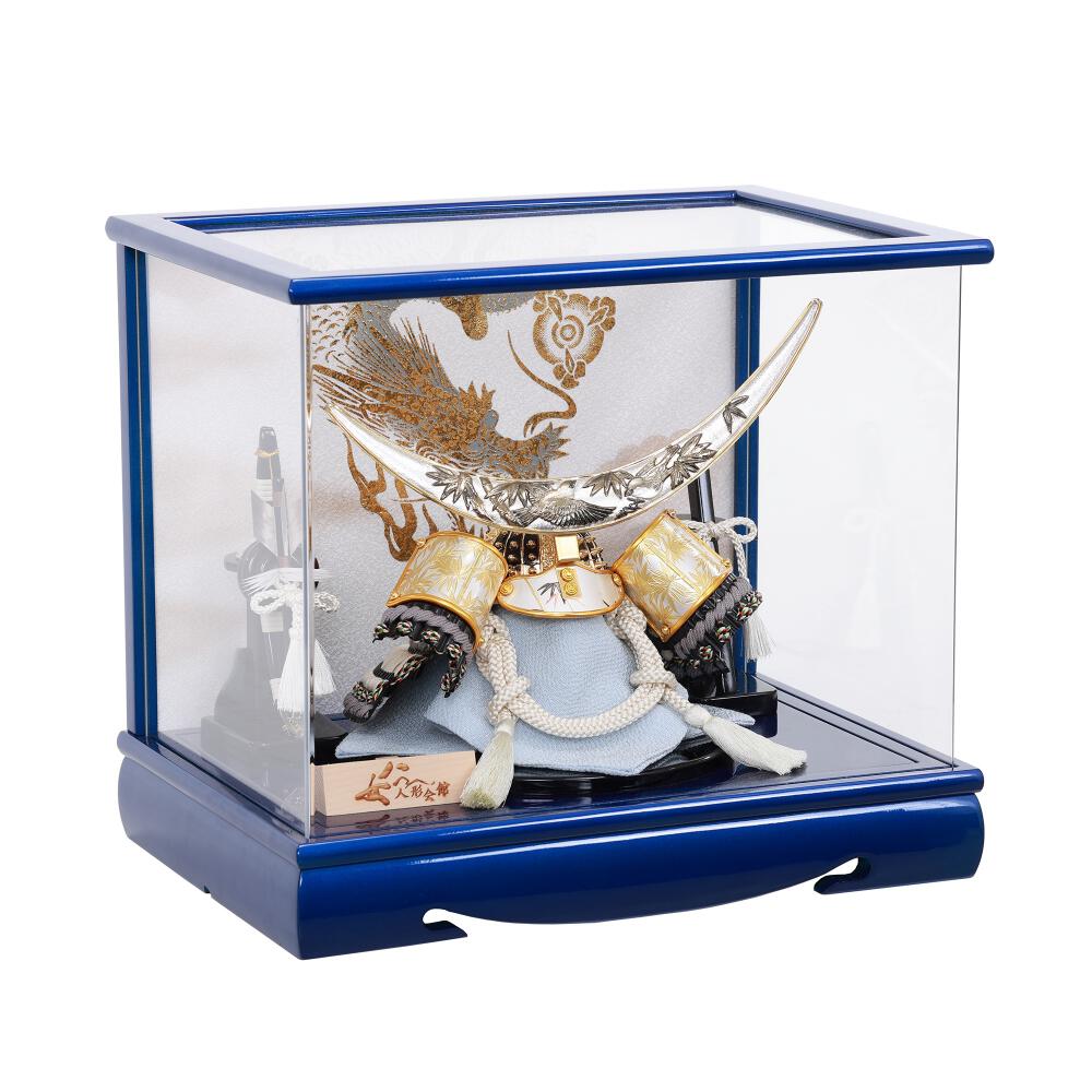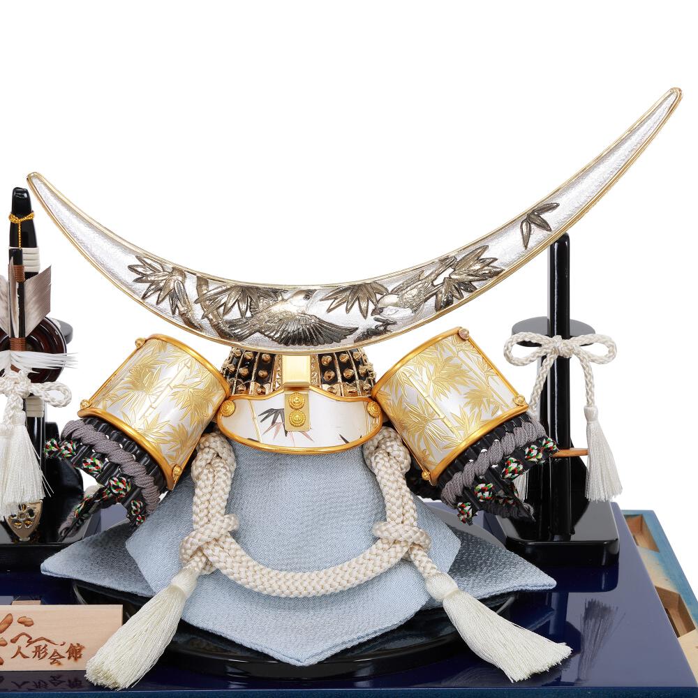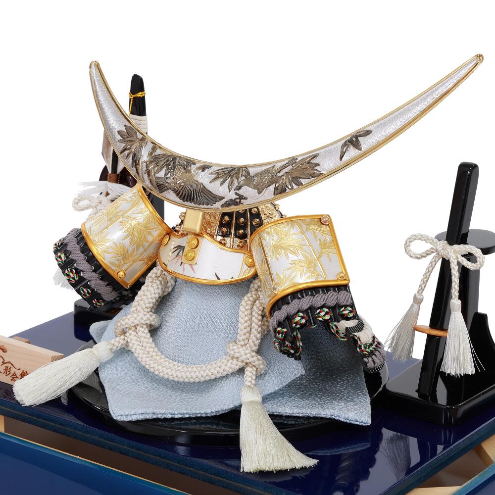 コンパクトながら、眉さし・前立てに彫金の竹雀柄を施した本格的な作りの縁起の良い兜です。