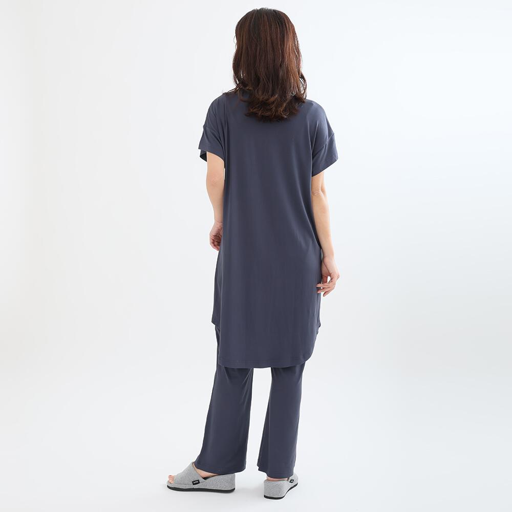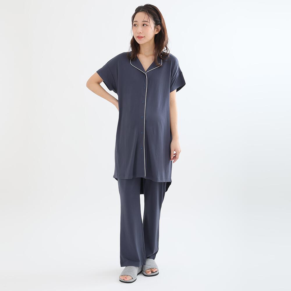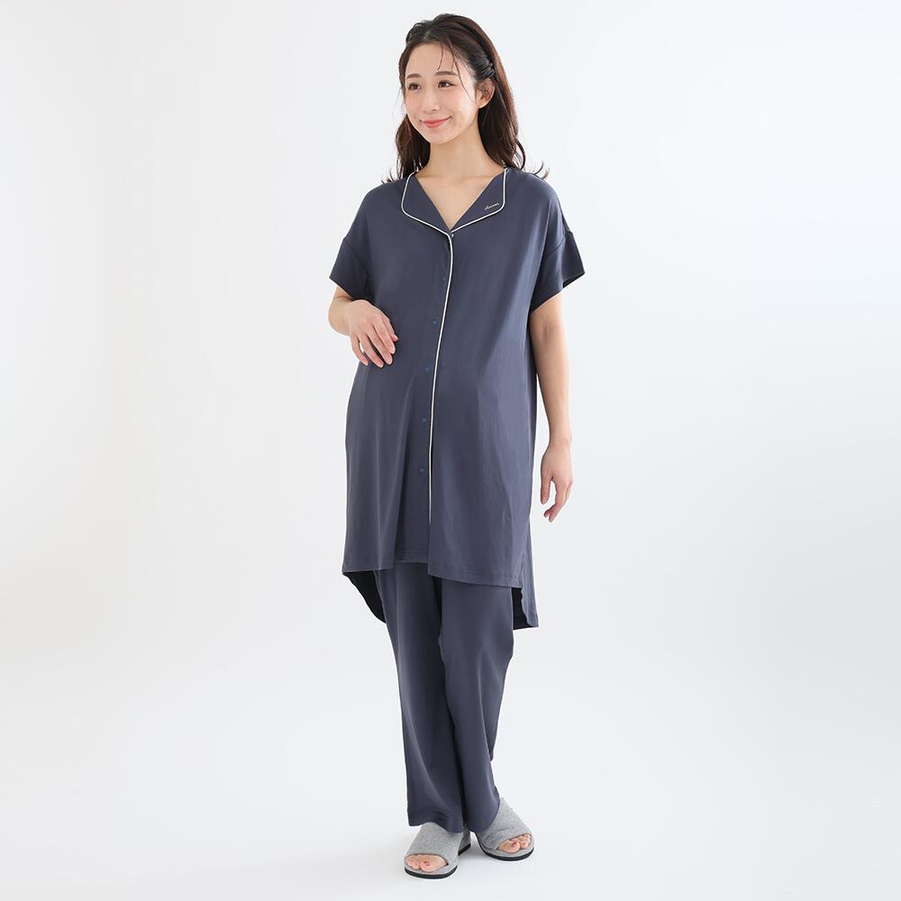 美デコルテ首元涼しい入院準備パジャマ ダークブルー M-L