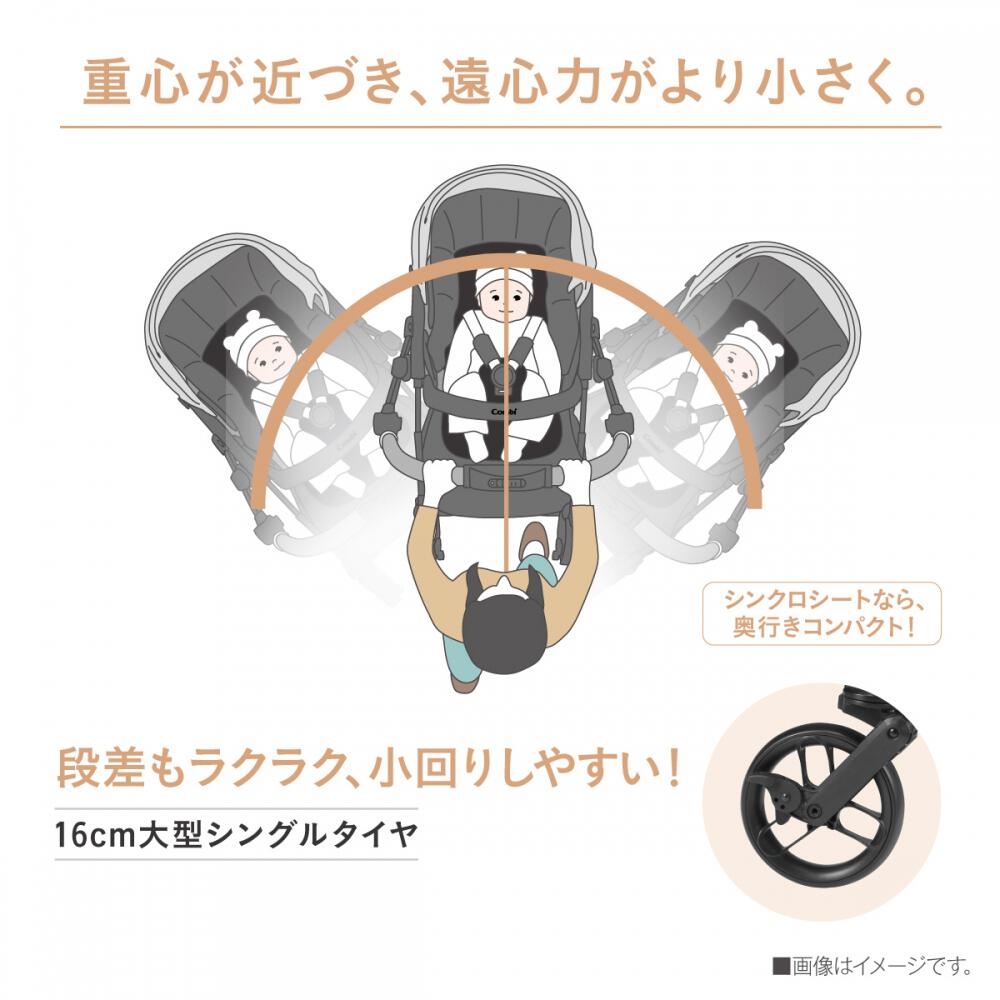 ハンドルを切り替えると、シートが手前にスライドして、赤ちゃんがグッと近づく新構造。