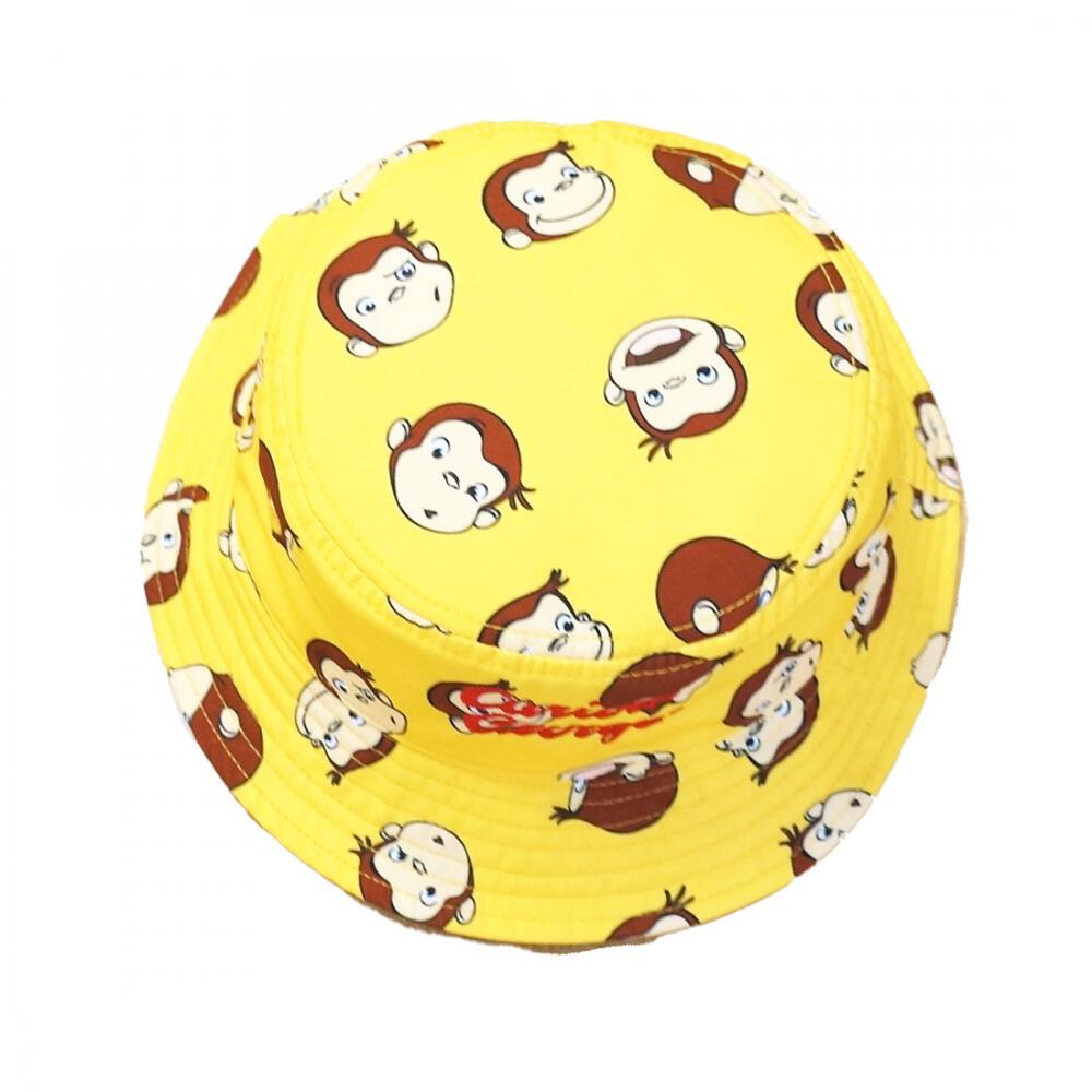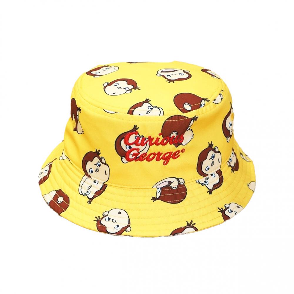 元気いっぱいのおさるのジョージが総柄でプリントされた、ポップでキュートなバケットハット。