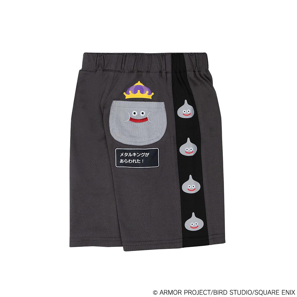 側面部分にはメタルスライム、後ろ側のポケットにはメタルキングがデザインされたハーフパンツです。ポケット下にさりげなくデザインされたメッセージウィンドウも、遊び心があってドラゴンクエストの世界観が広がります。