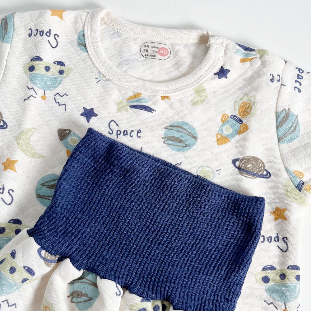 お腹を冷やさない腹巻き付きデザインだから、寝ている間にパジャマがめくれても安心。