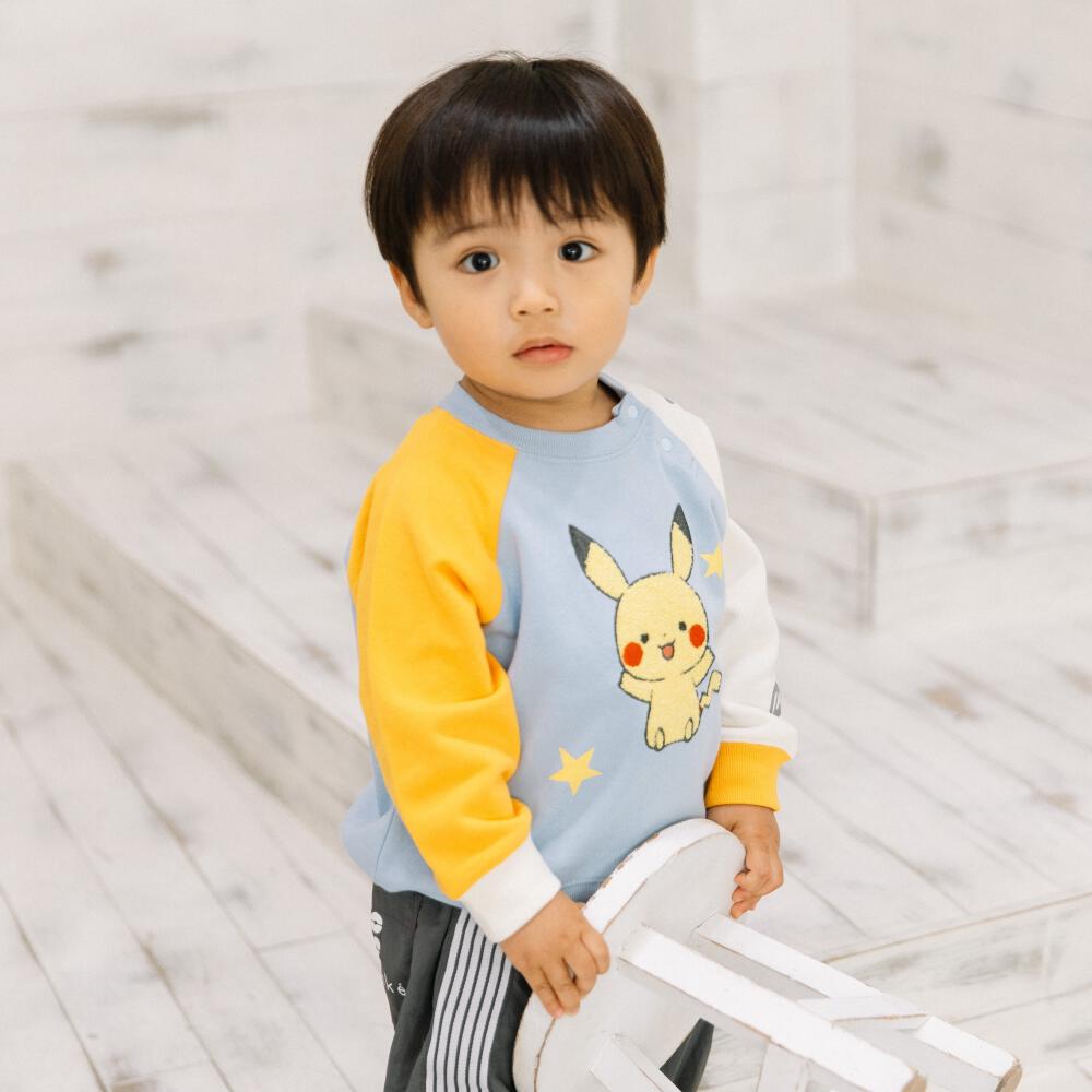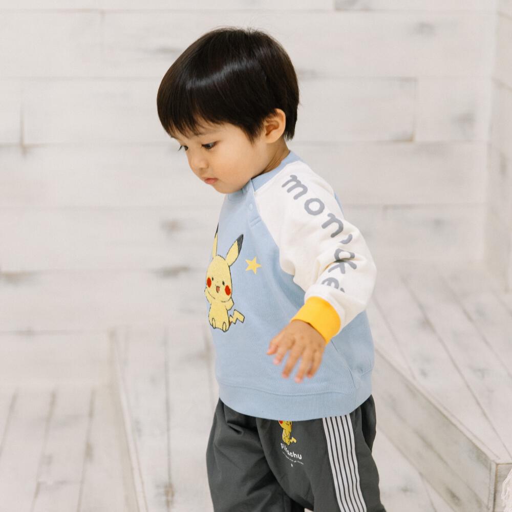 monpoke モンポケ トレーナー 袖配色 サガラ刺繍 ピカチュウ ブルー×100cm