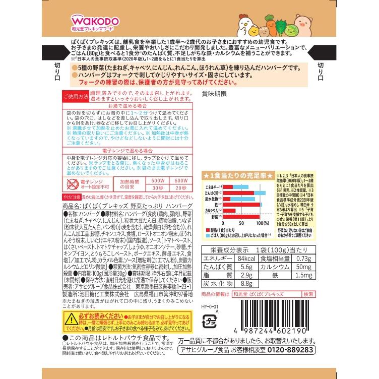 ハンバーグ(食肉(鶏肉、豚肉)、野菜(たまねぎ、キャベツ、にんじん)、粒状大豆たん白、植物油脂、つなぎ(粉末状大豆たん白、パン粉(小麦を含む)、乾燥卵白(卵を含む))、れんこん加工品、砂糖、チキンエキス、食塩、ローストオニオン粉末、ほうれんそう粉末、しいたけエキス粉末)(国内製造)、ソース[トマトペースト、はくさいペースト、トマトケチャップ、しょうゆ、オニオンソテー、砂糖、チキンブイヨン、とうもろこしペースト、ポークエキス、酵母エキス、食塩]/加工でん粉、カラメル色素、ソース[増粘剤(加工でん粉)、炭酸カルシウム、ピロリン酸鉄]