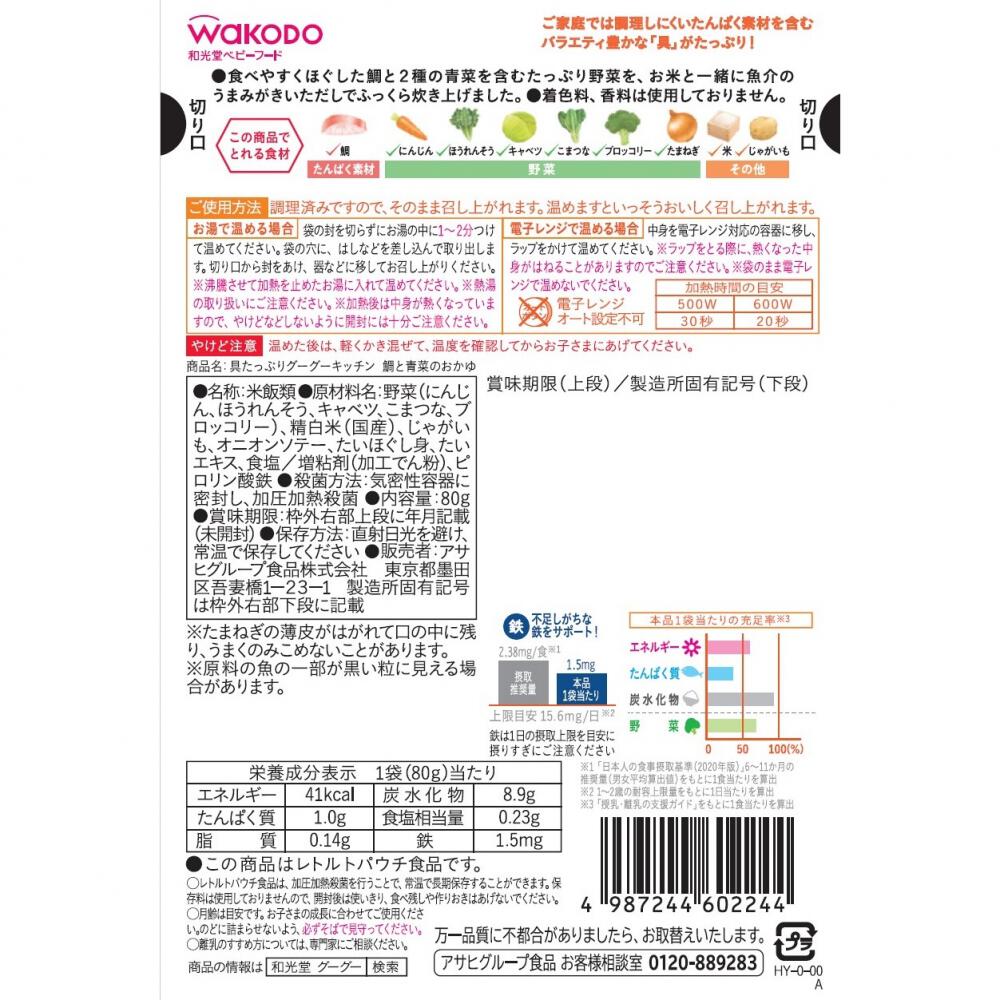 野菜(にんじん、ほうれんそう、キャベツ、こまつな、ブロッコリー)、精白米(国産)、じゃがいも、オニオンソテー、たいほぐし身、たいエキス、食塩/増粘剤(加工でん粉)、ピロリン酸鉄