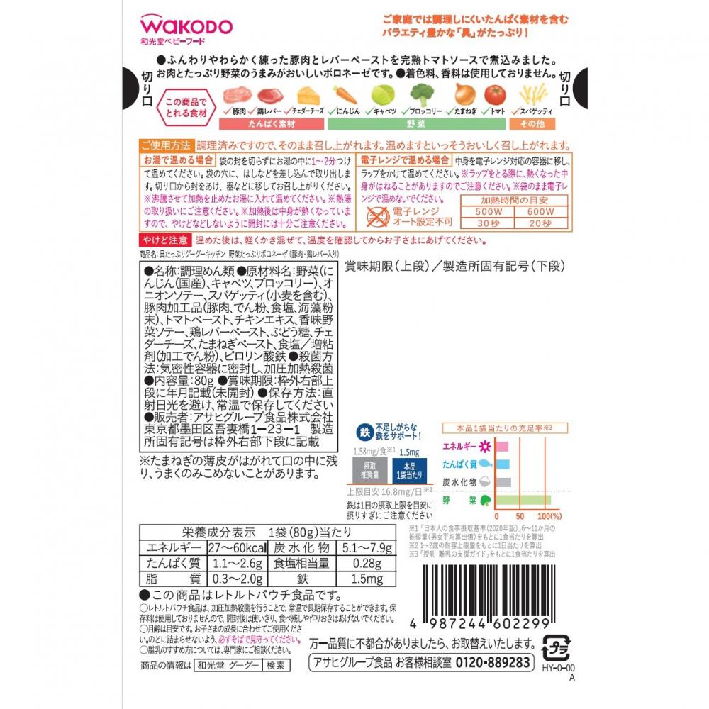 野菜(にんじん(国産)、キャベツ、ブロッコリー)、オニオンソテー、スパゲッティ(小麦を含む)、豚肉加工品(豚肉、でん粉、食塩、海藻粉末)、トマトペースト、チキンエキス、香味野菜ソテー、鶏レバーペースト、ぶどう糖、チェダーチーズ、たまねぎペースト、食塩/増粘剤(加工でん粉)、ピロリン酸鉄
