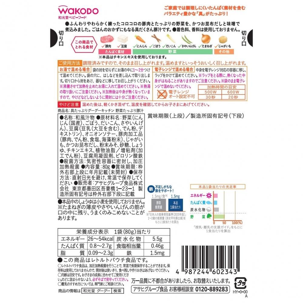 野菜(にんじん(国産)、ごぼう、だいこん、さやいんげん)、豆腐(豆乳(大豆を含む)、でん粉、デキストリン)、オニオンソテー、豚肉加工品(豚肉、でん粉、食塩、海藻粉末)、じゃがいも、かつお昆布だし、粉末みそ、砂糖、しょうゆ、チキンエキス、植物油脂/増粘剤(加工でん粉)、豆腐用凝固剤、ピロリン酸鉄