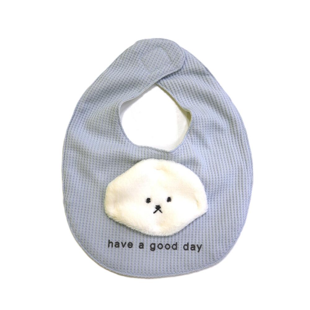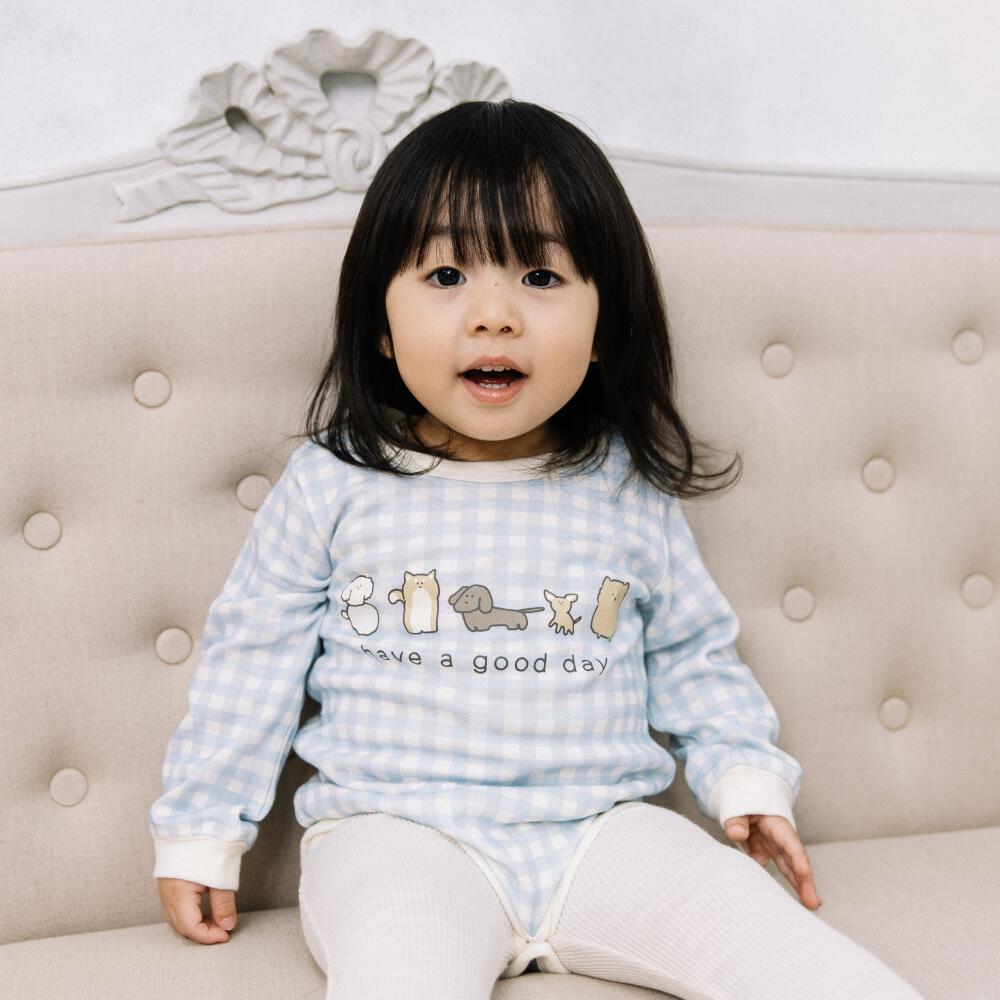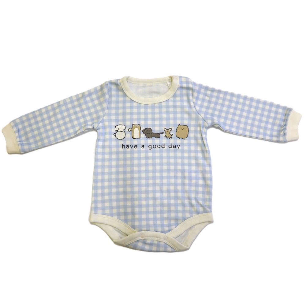 【ベビー×ペットコレクション】長袖ボディスーツ スタイ付き 格子柄 スムス イヌ ブルー×70cm